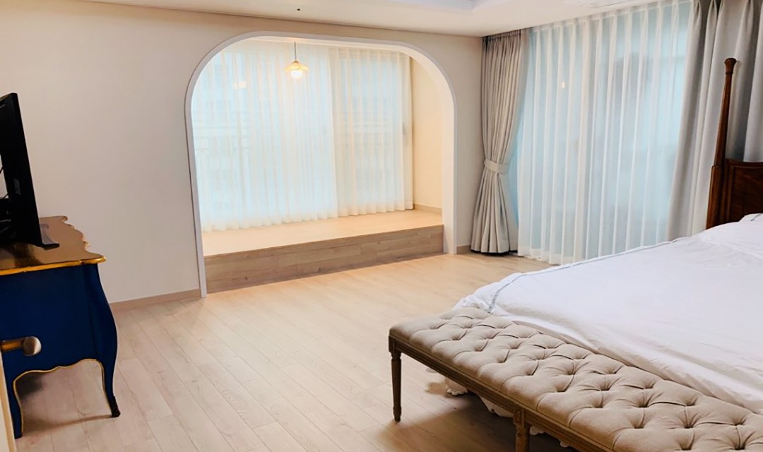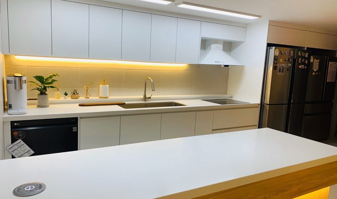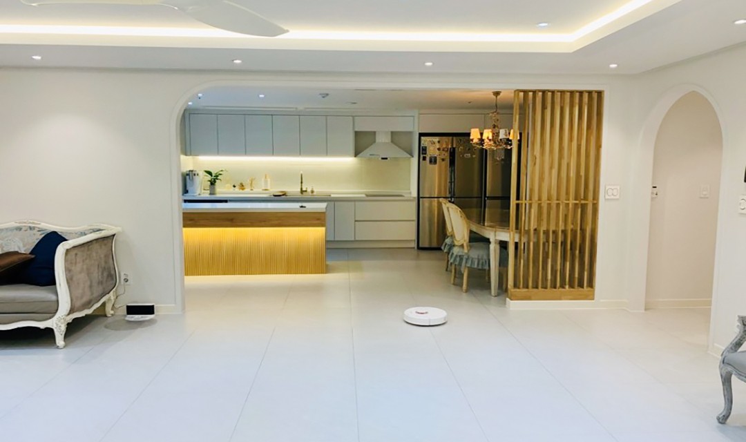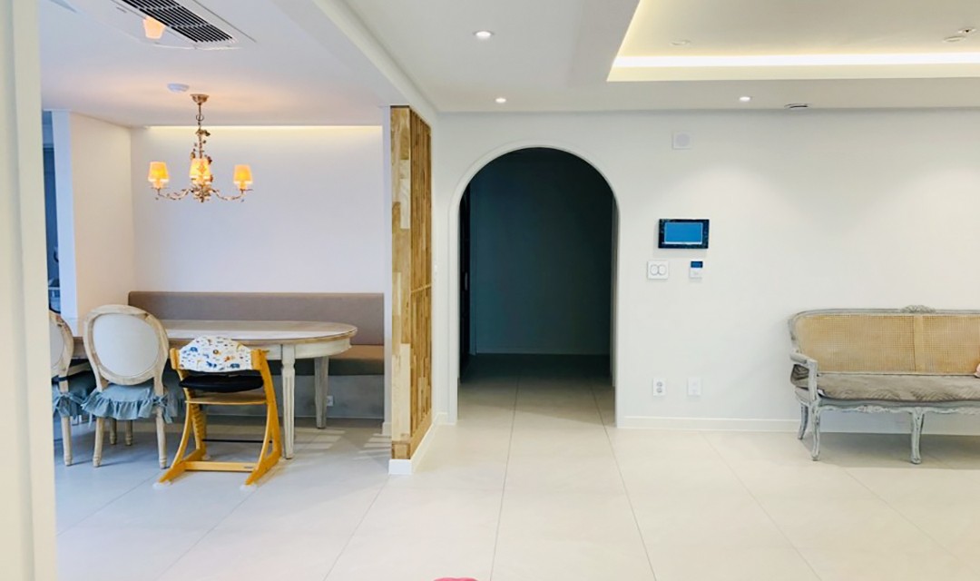#고급 #모던클래식 #유니크 #화사한 #아치 #목공사 #화이트 #중문 #간살도어 #포세린타일 #아일랜드식탁 #샹들리에 #간접조명 #실링팬 #50평 #아파트인테리어