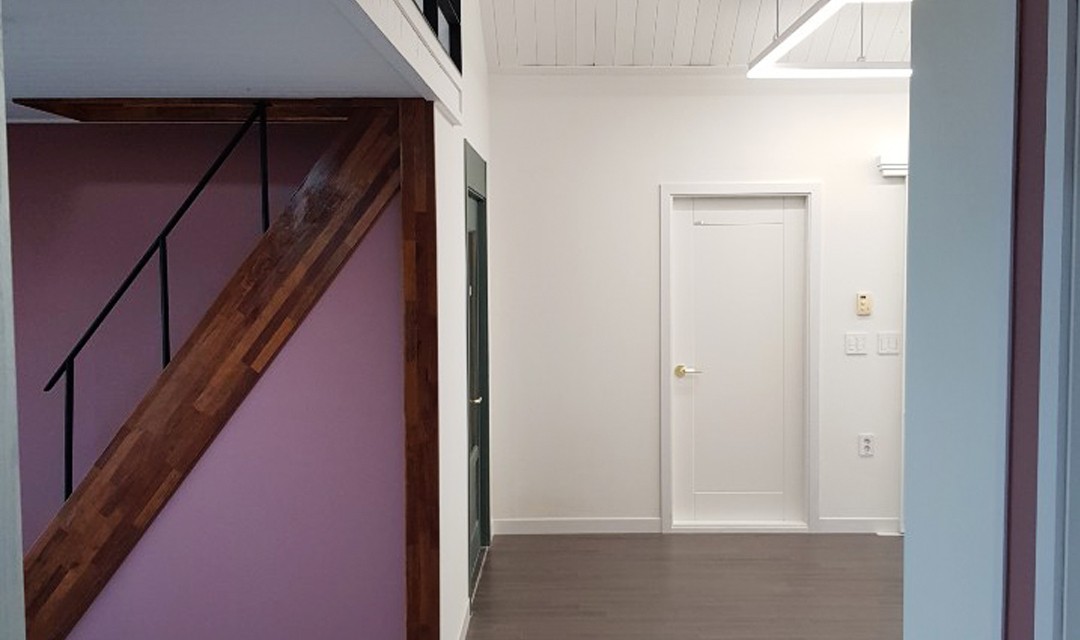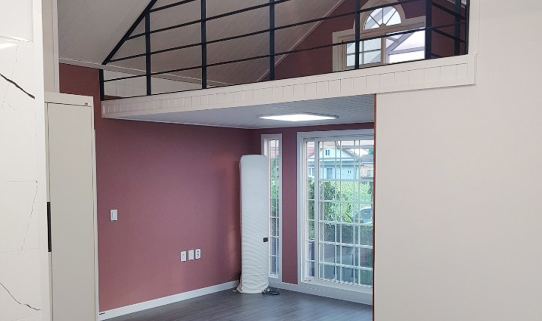 #고급 #모던 #무드 #목공사 #철재난간 #화이트 #그레이 #브라운 #중문 #비대칭도어 #일체형레일등 #붙박이장 #30평 #주택인테리어