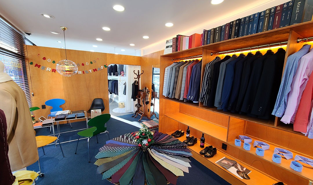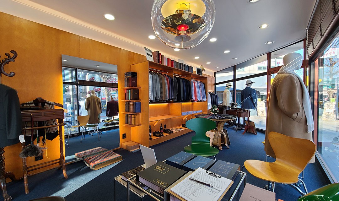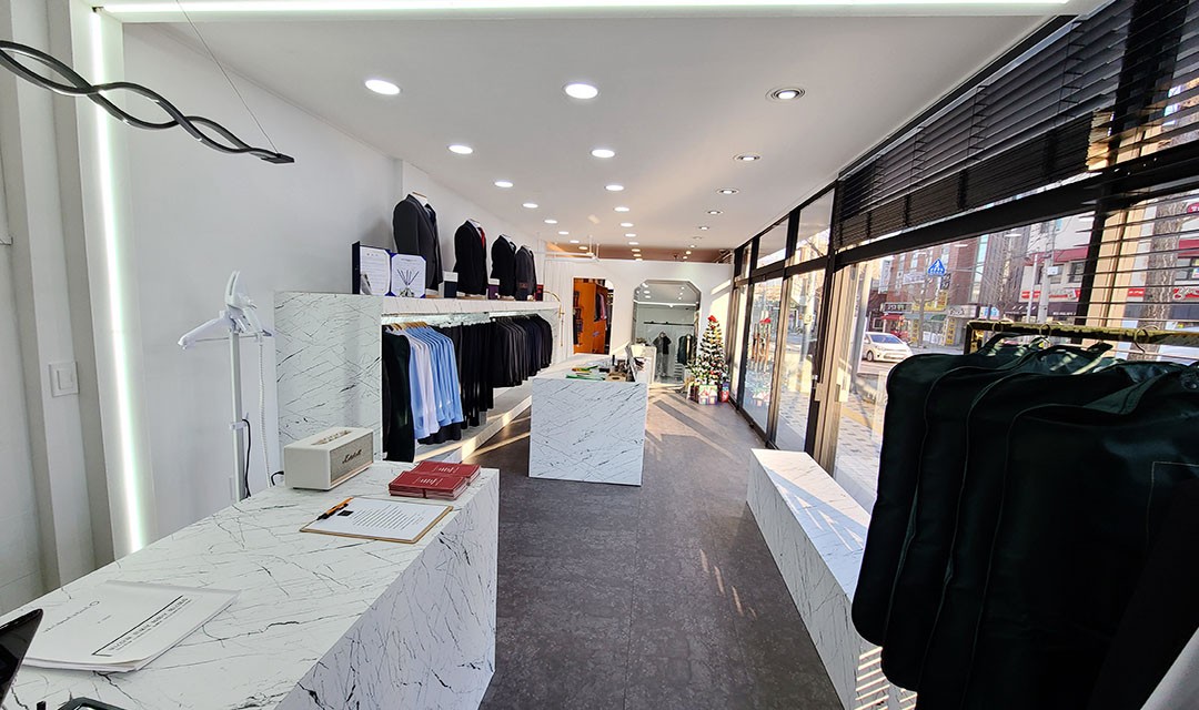 #모던 #세련된 #따뜻한 #감각적 #우드 #블루 #화이트 #그레이 #라인조명 #간접조명 #매립등 #10평 #옷가게인테리어 #양복점인테리어 #정장가게인테리어