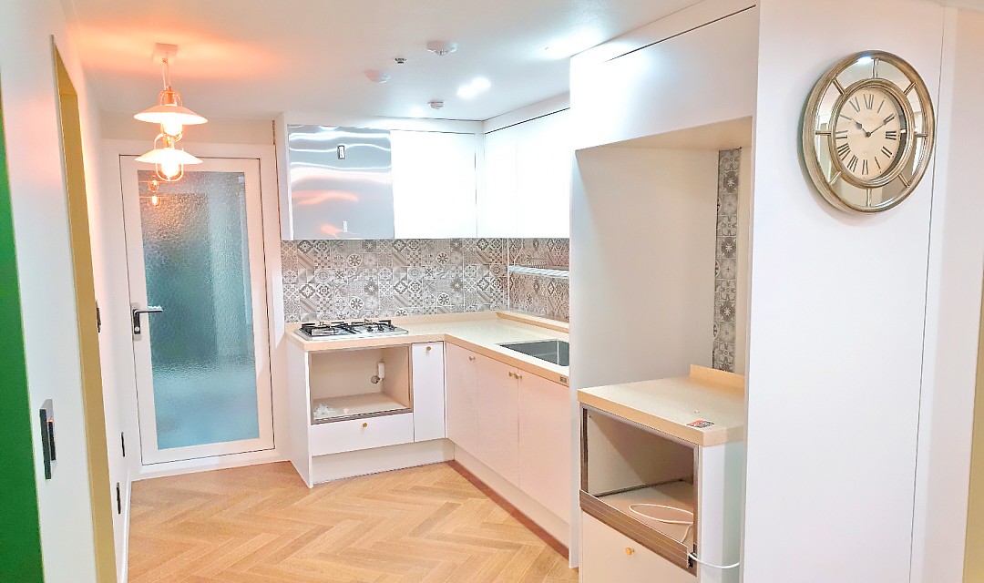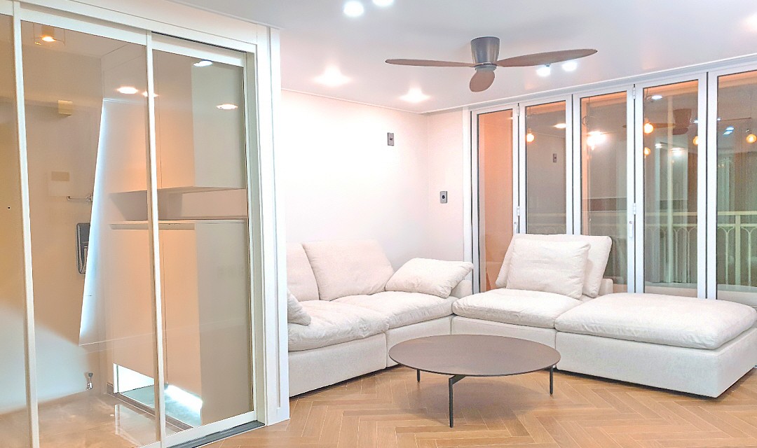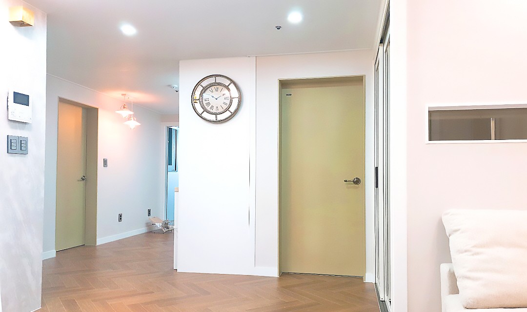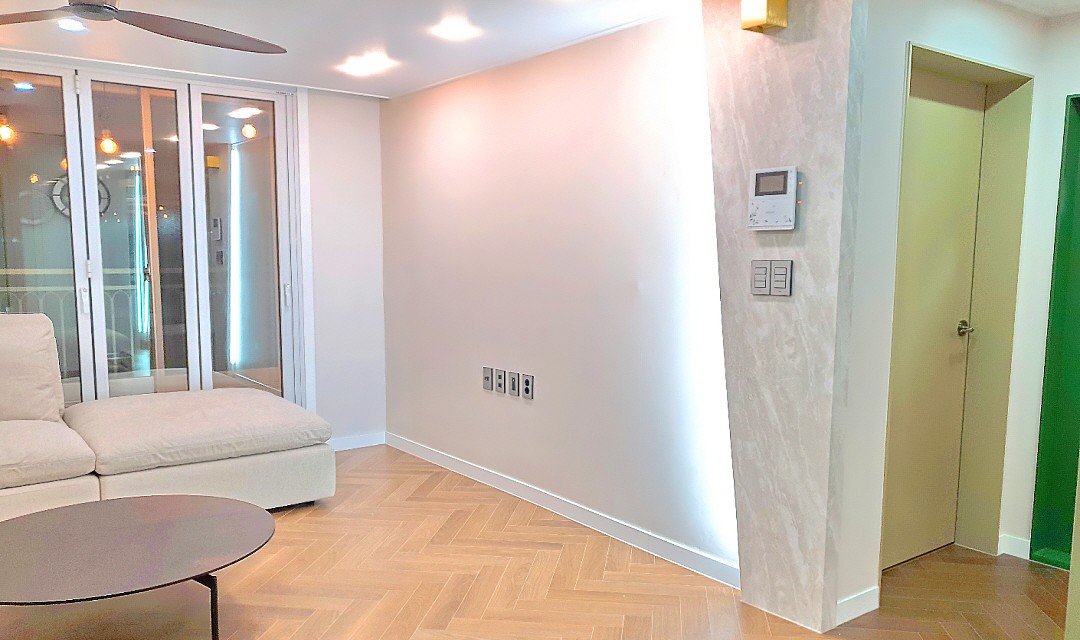 #모던 #네추럴 #트렌디 #심플 #감성 #중문시공 #3중연동 #타일시공 #폴리싱타일 #패턴타일 #해링본마루 #실링팬 #인테리어조명 #매립조명 #폴딩도어 #비비드컬러 #20평 #아파트인테리어