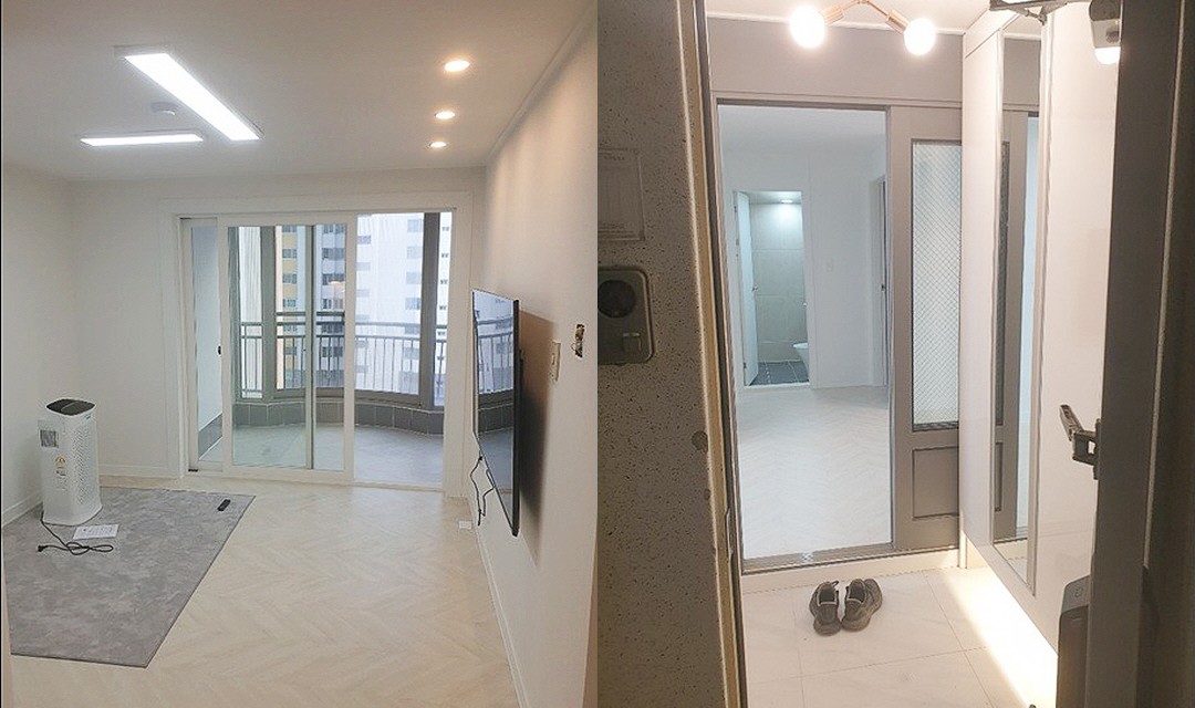 #모던 #심플 #네추럴 #중문시공 #3중연동 #타일시공 #비앙코타일 #폴리싱타일 #인테리어조명 #간접조명 #매립조명 #화이트 #20평 #아파트인테리어