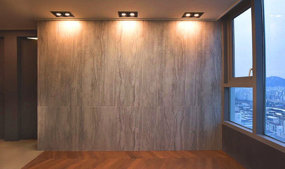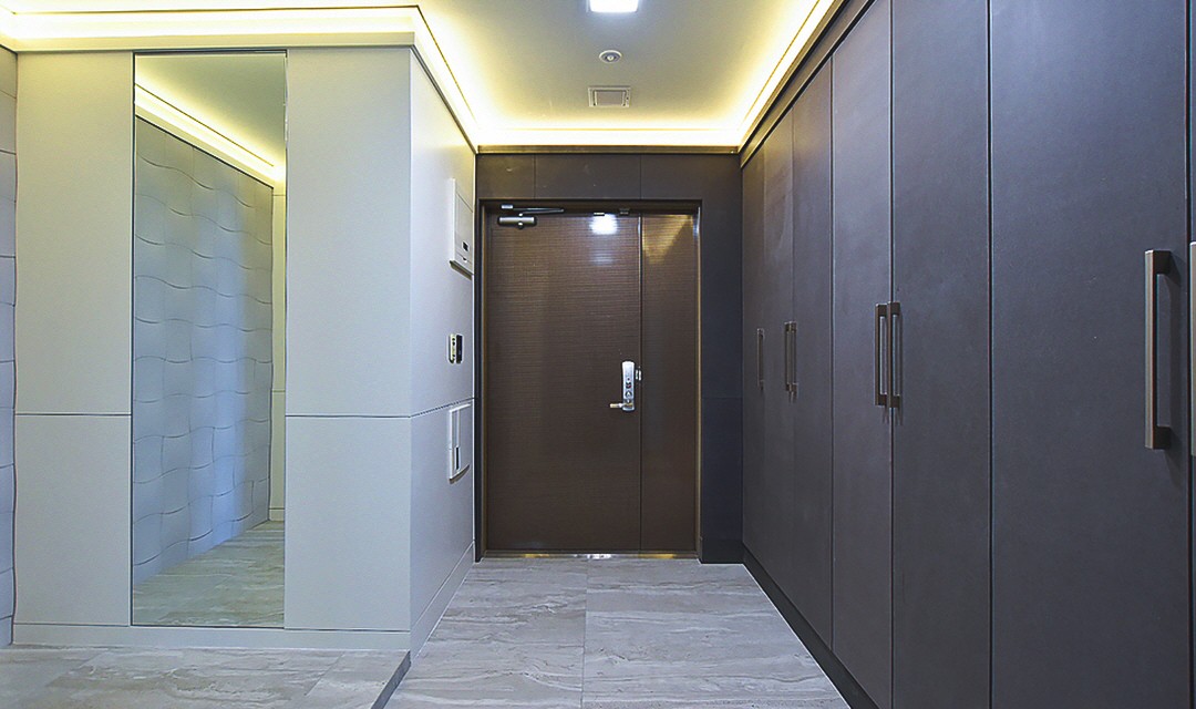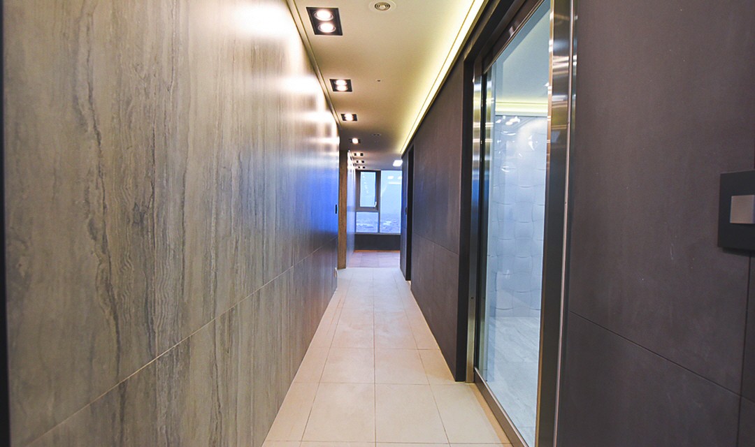 박판 타일로 한 쪽 벽면을 디자인하여 고급스럽고 모던한 느낌의 복도를 완성하였습니다.