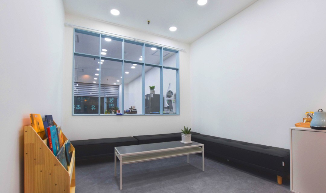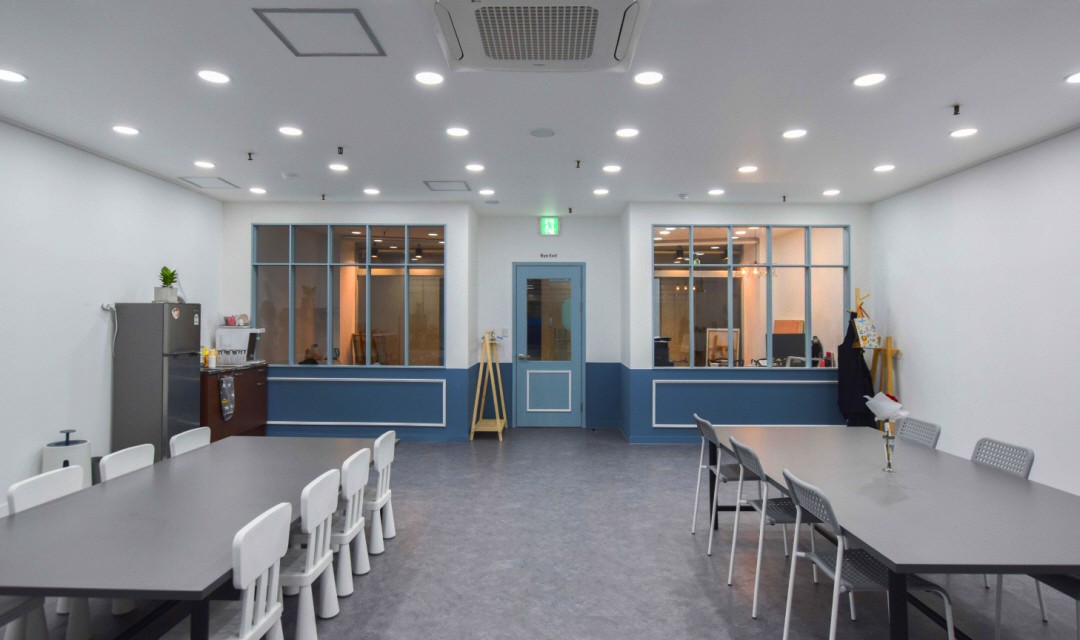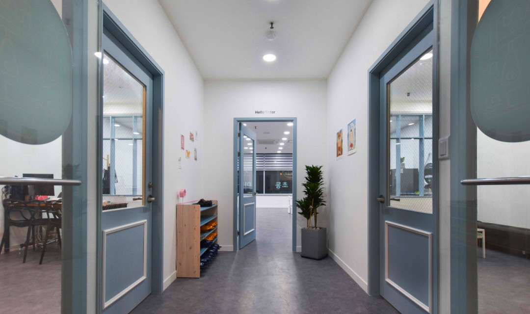 밝은 교육공간, 얇은 프레임의 창호디자인, 웨인스코팅을 이용한 위트있는 공간입니다.