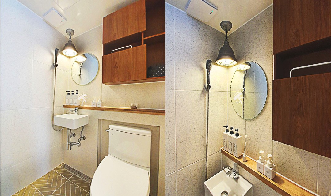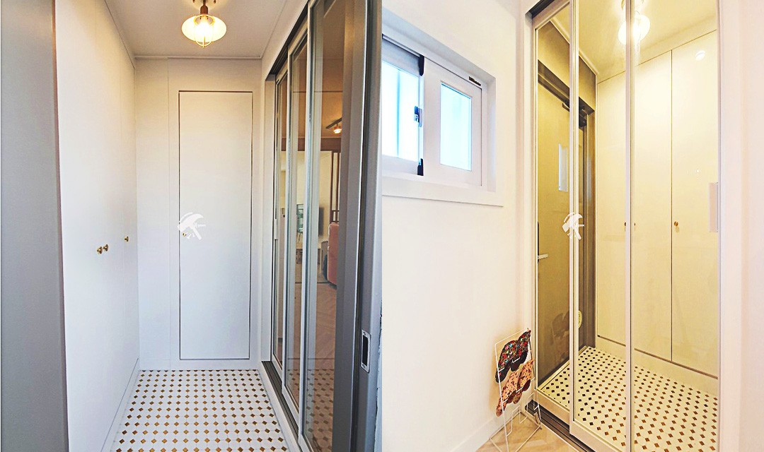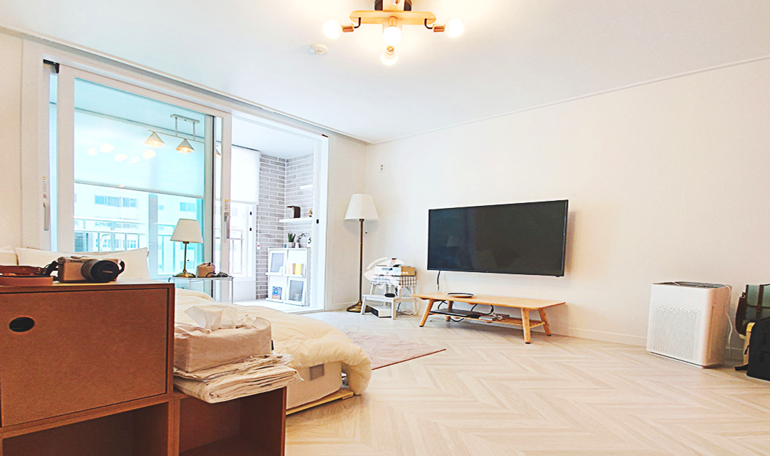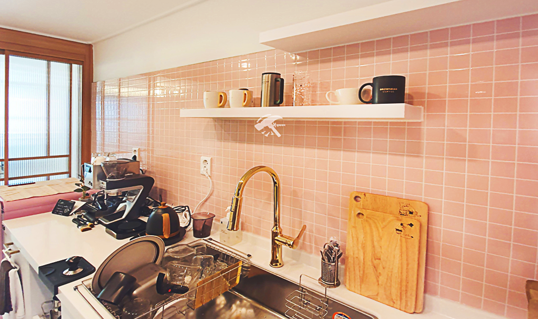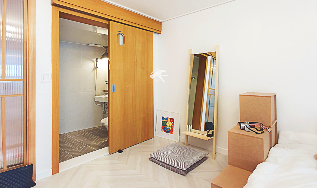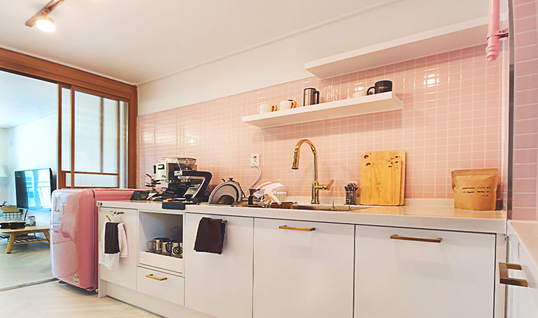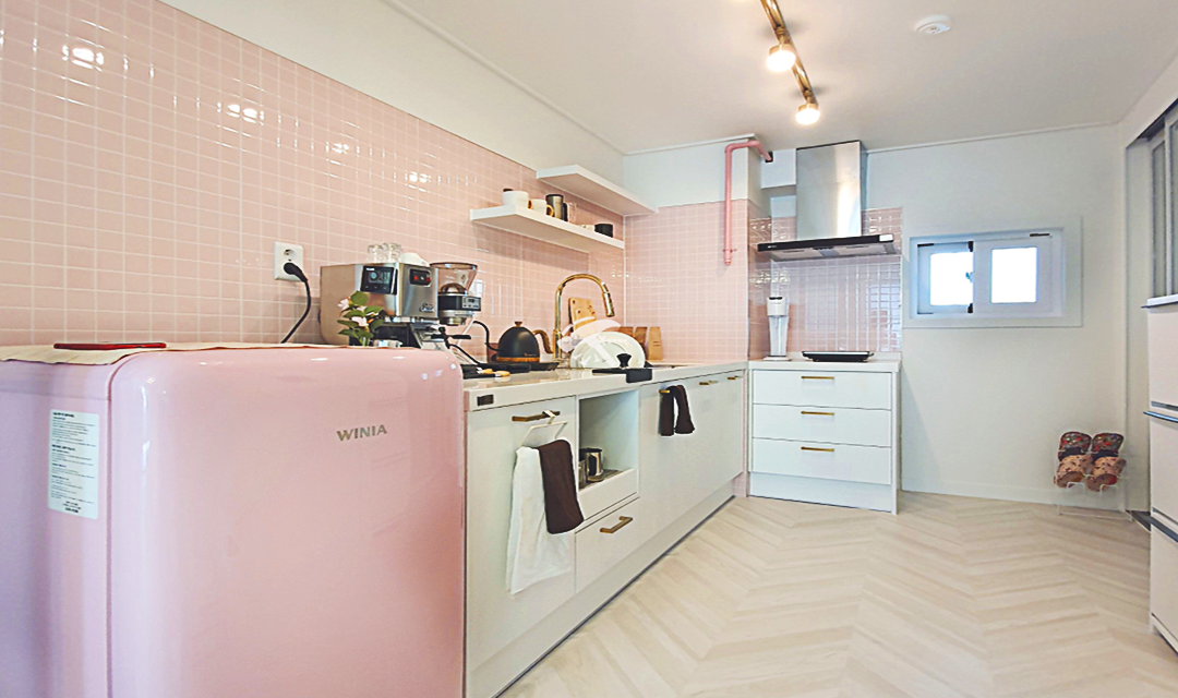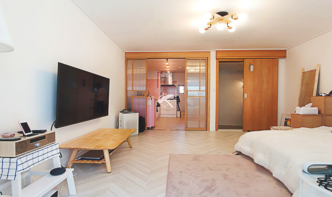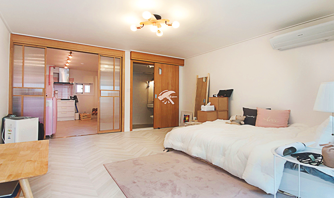 #러블리 #트렌디 #감성 #유니크 #중문시공 #타일시공 #슬라이딩도어 #쉐브른마루 #핑크 #우드 #인테리어조명 #레일조명 #10평 #원룸인테리어 #자취방인테리어