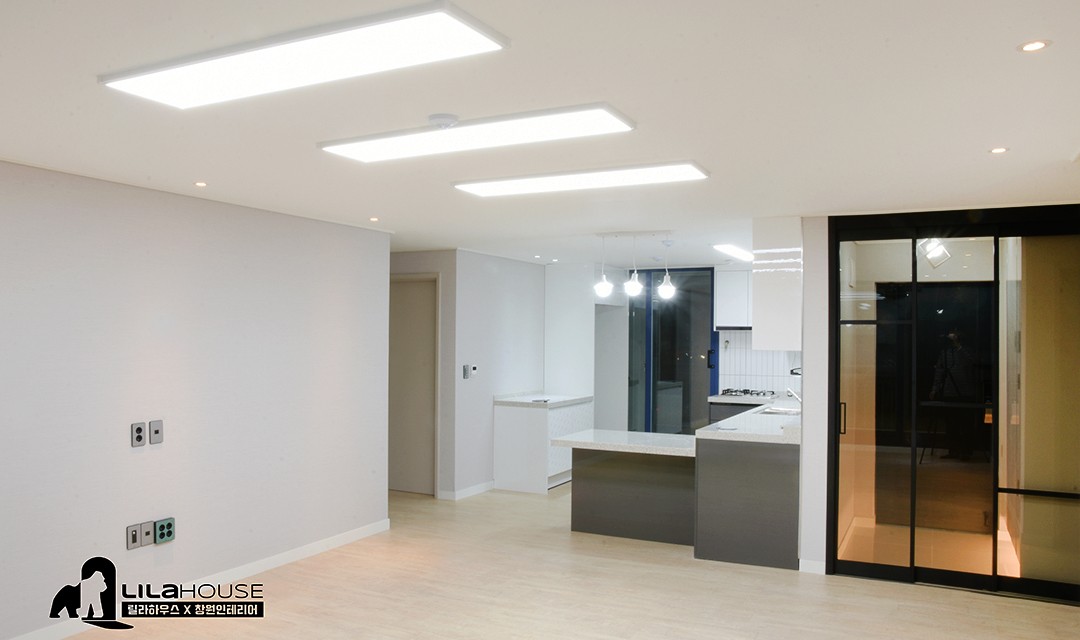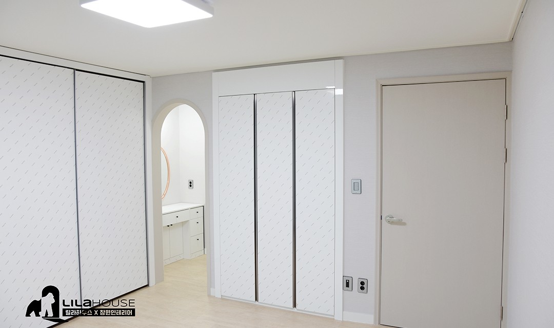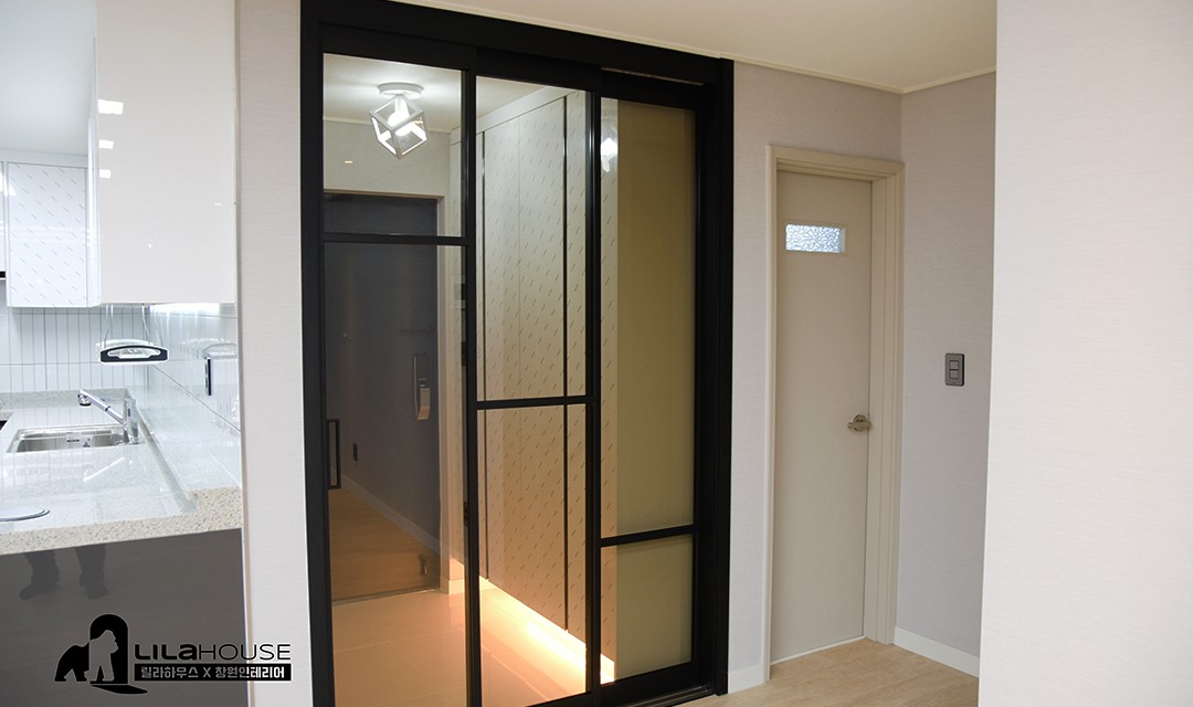 #은은한 #모던 #심플 #세련 #라이트그레이 #중문 #초슬림3연동도어 #브론즈유리 #블루필름지 #매립조명 #히트콘센트 #친환경 #아파트인테리어