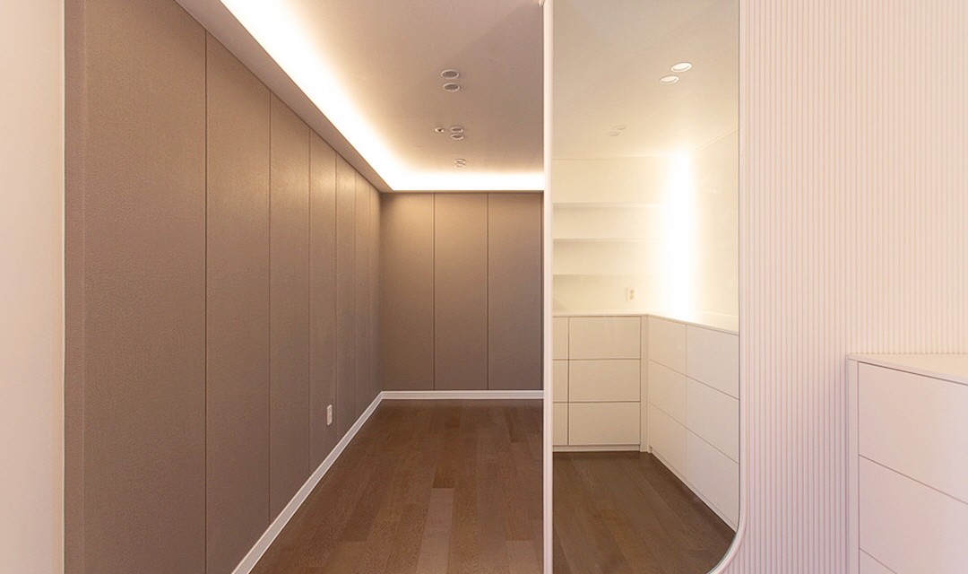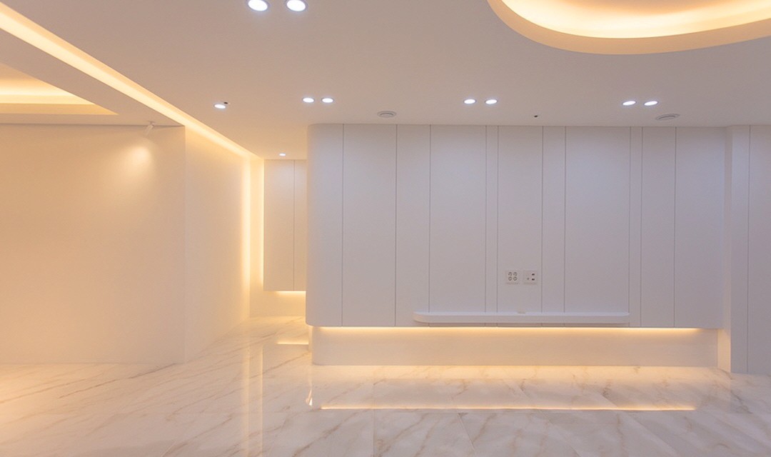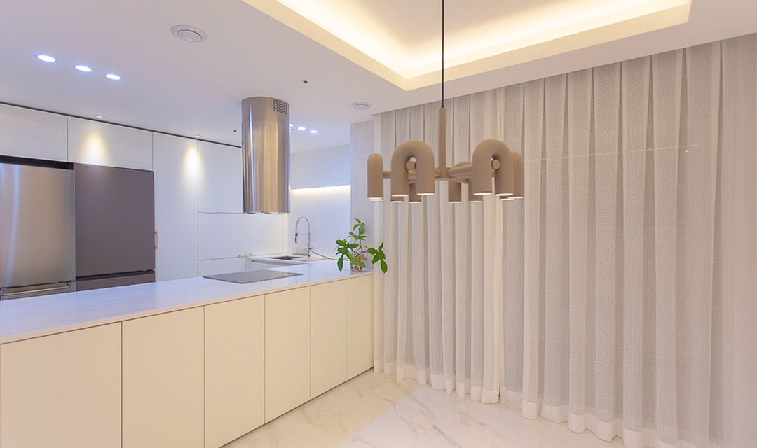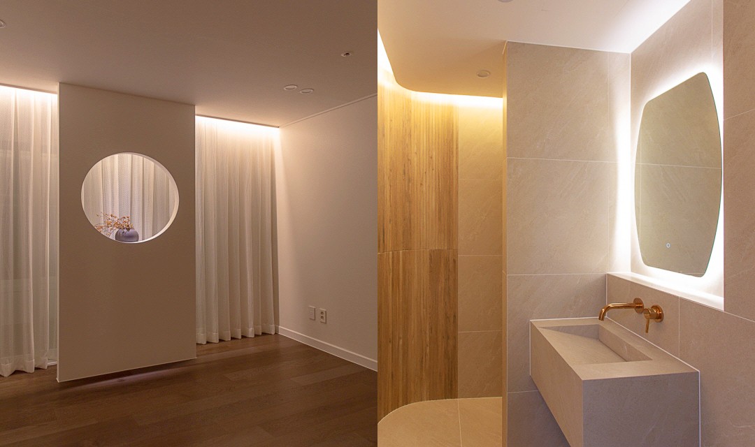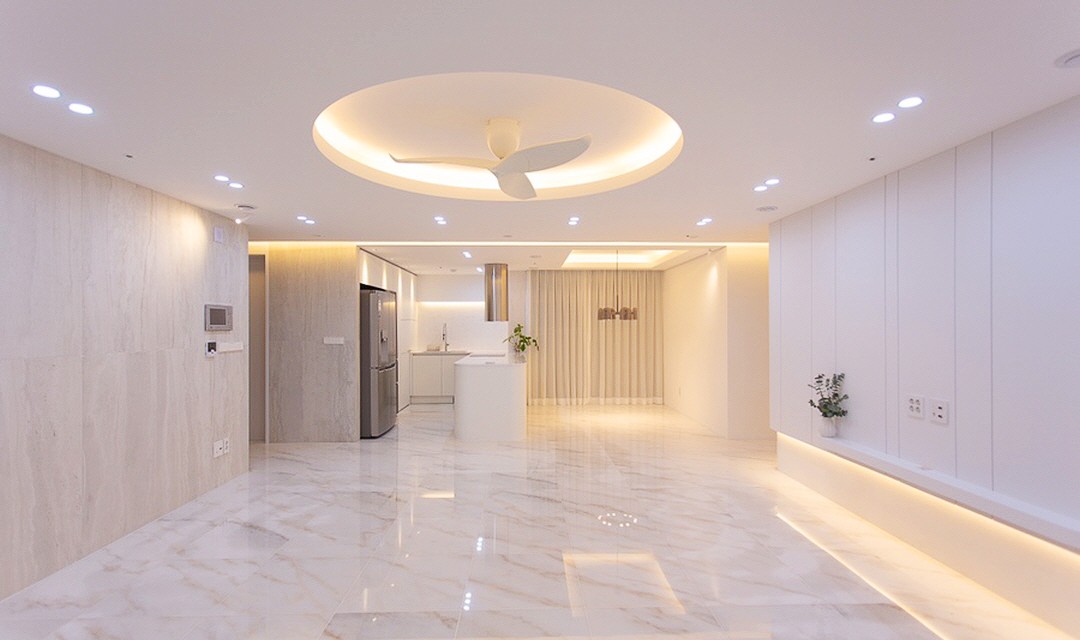 #감성 #럭셔리 #모던 #트렌디 #라운드포인트 #중문시공 #비대칭양개도어 #타일시공 #폴리싱타일 #비앙코타일 #포세린타일 #가벽설치 #인테리어조명 #매립조명 #간접조명 #실링팬 #40평 #아파트인테리어