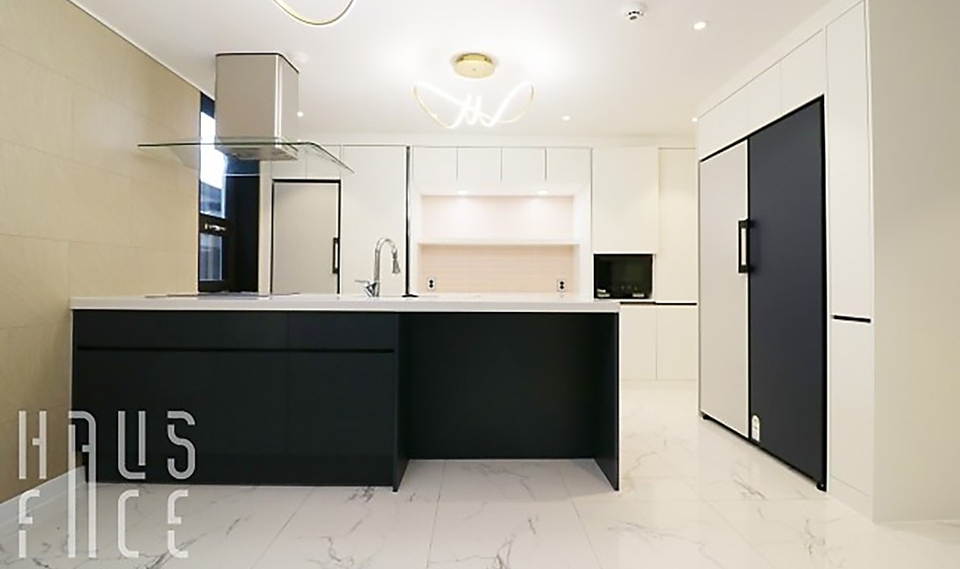 #럭셔리 #고급 #세련 #화이트 #블랙 #우드컬러 #폴리싱타일 #비스코프냉장고 #아일랜드식탁 #포인트조명 #매립조명 #간접조명 #주택인테리어
