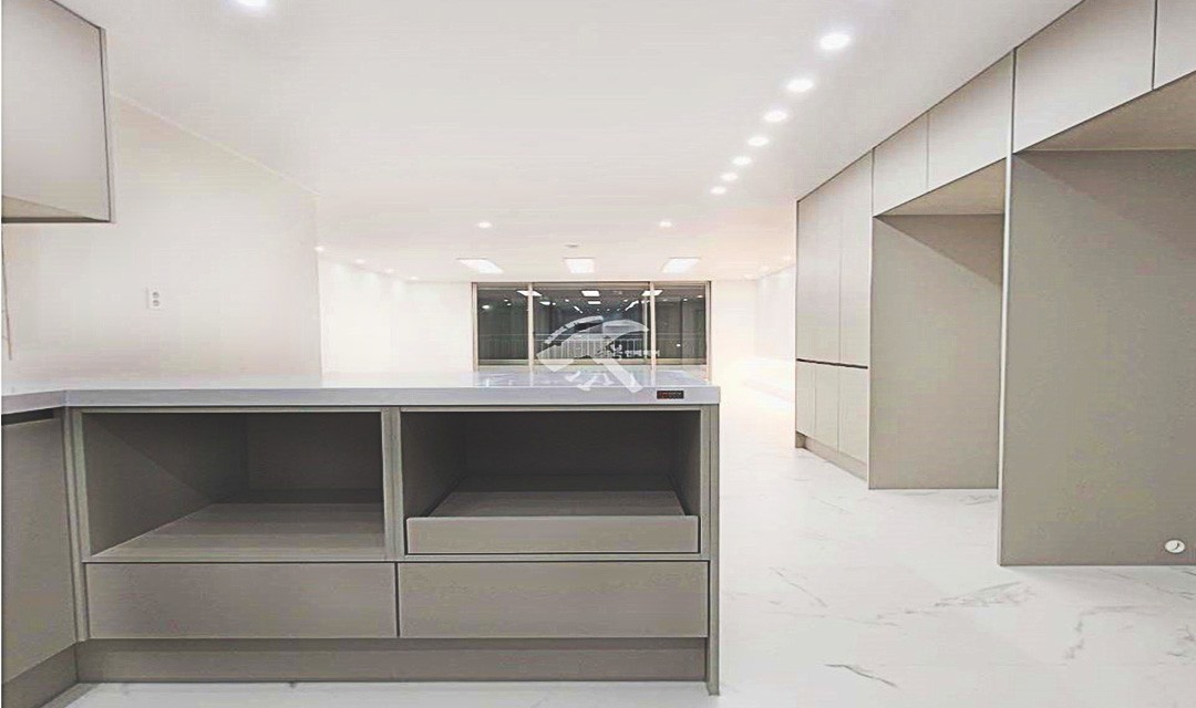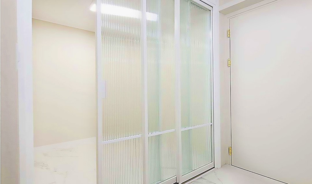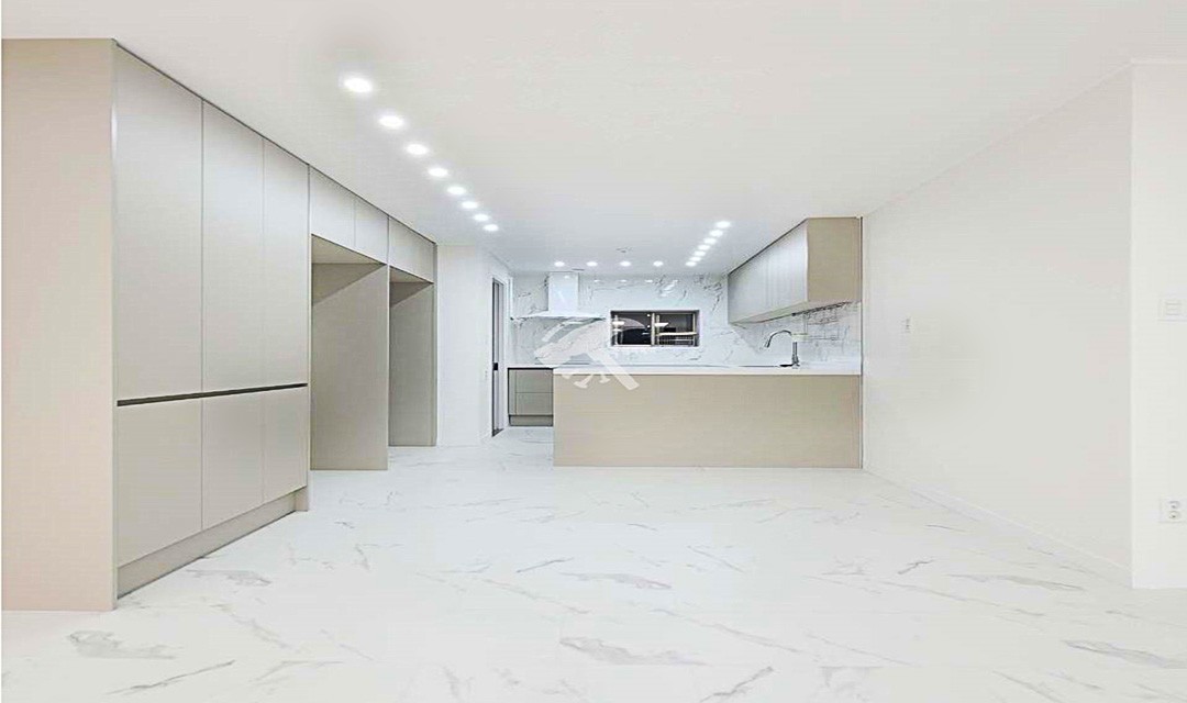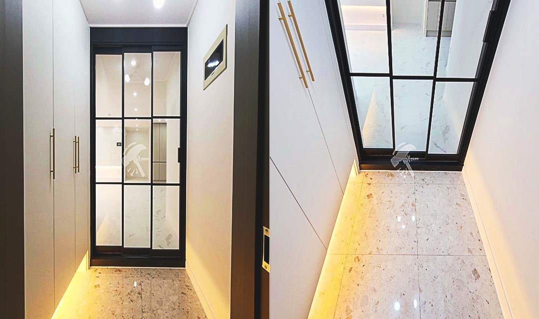 #트렌디 #모던 #중문시공 #3연동도어 #타일시공 #테라조타일 #폴리싱타일 #매립조명 #확장시공 #베이지 #그레이 #슬림도어 #40평 #아파트인테리어