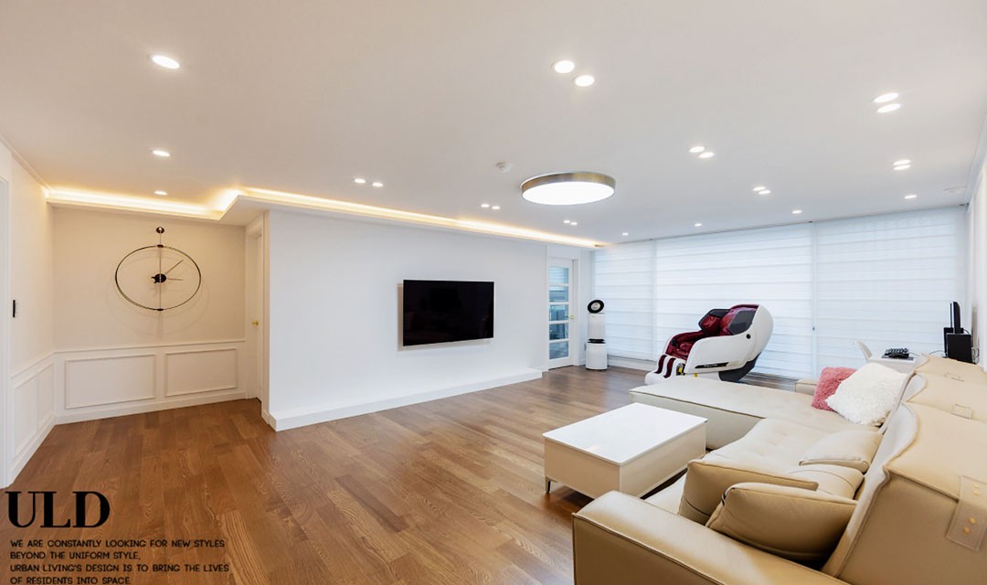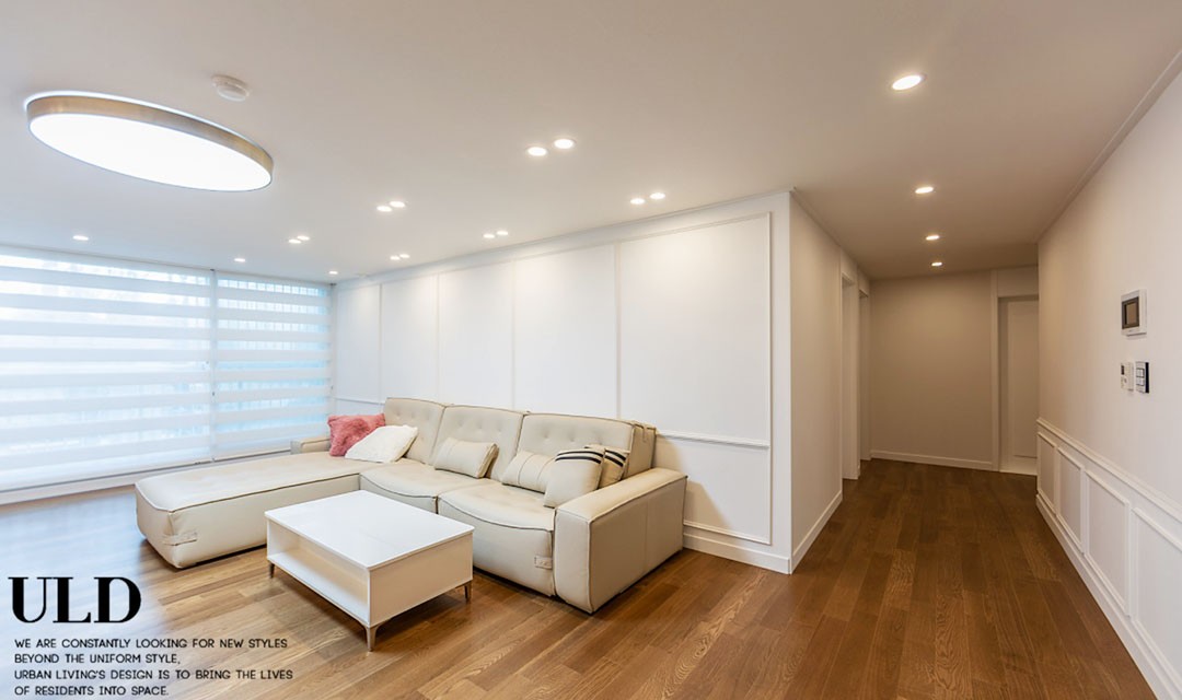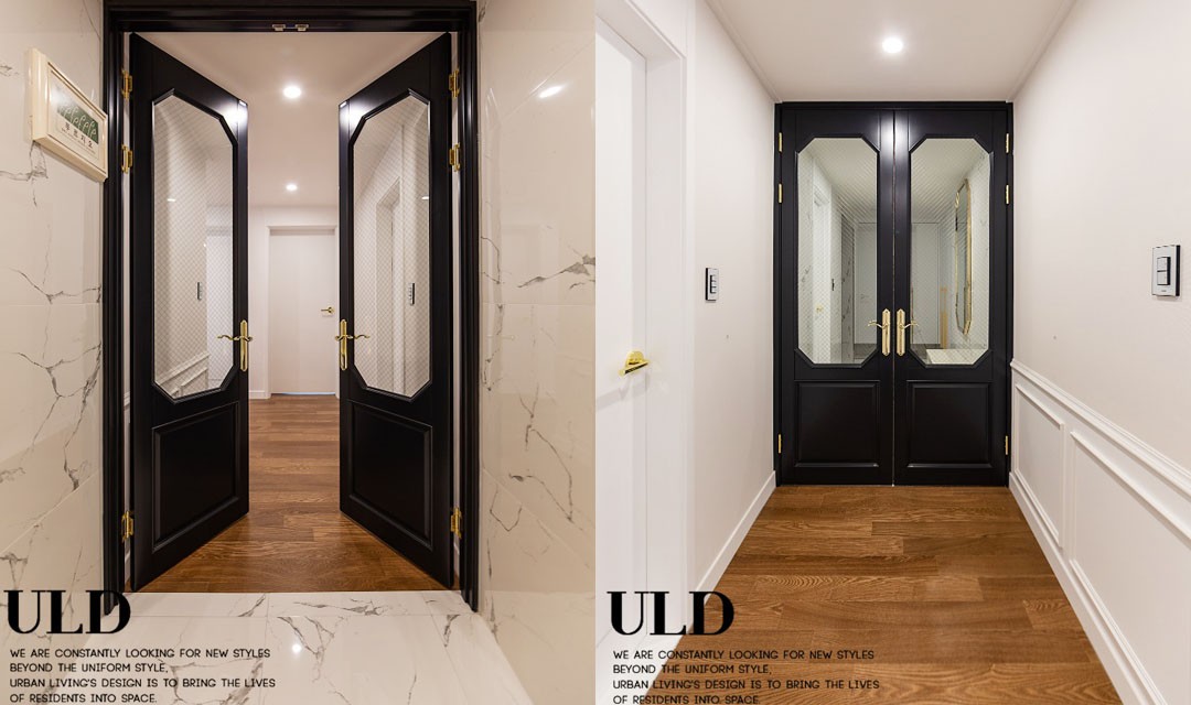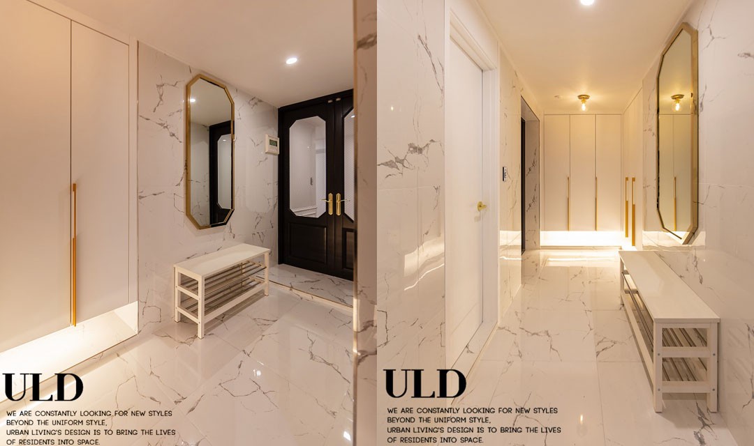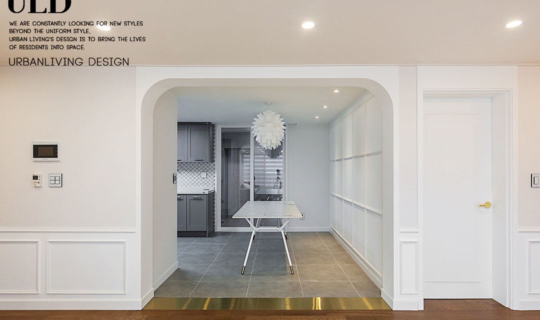 #고급 #모던클래식 #웨인스코팅 #화이트 #브라운 #중문 #포쉐린타일 #간접조명 #펜던트조명 #매립조명 #40평 #아파트인테리어