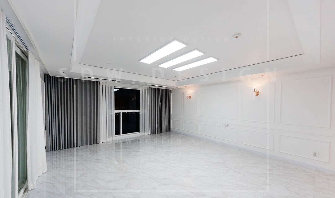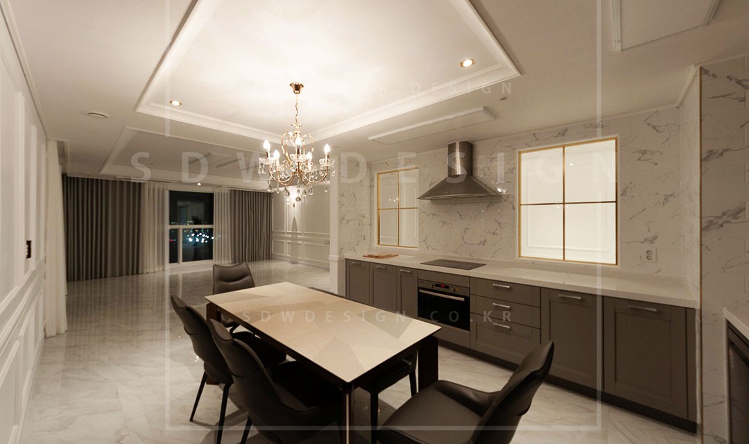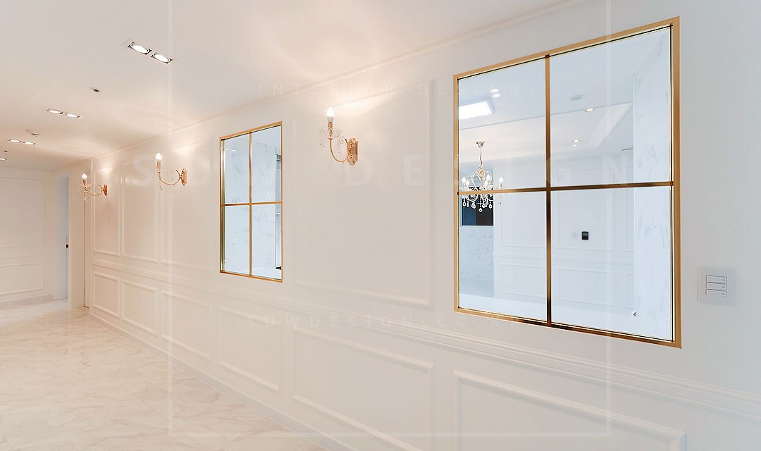#고급 #럭셔리 #모던클래식 #웨인스코팅 #화이트 #중문 #슬라이딩도어 #폴리싱타일 #샹들리에 #벽등 #매립조명 #50평 #아파트인테리어