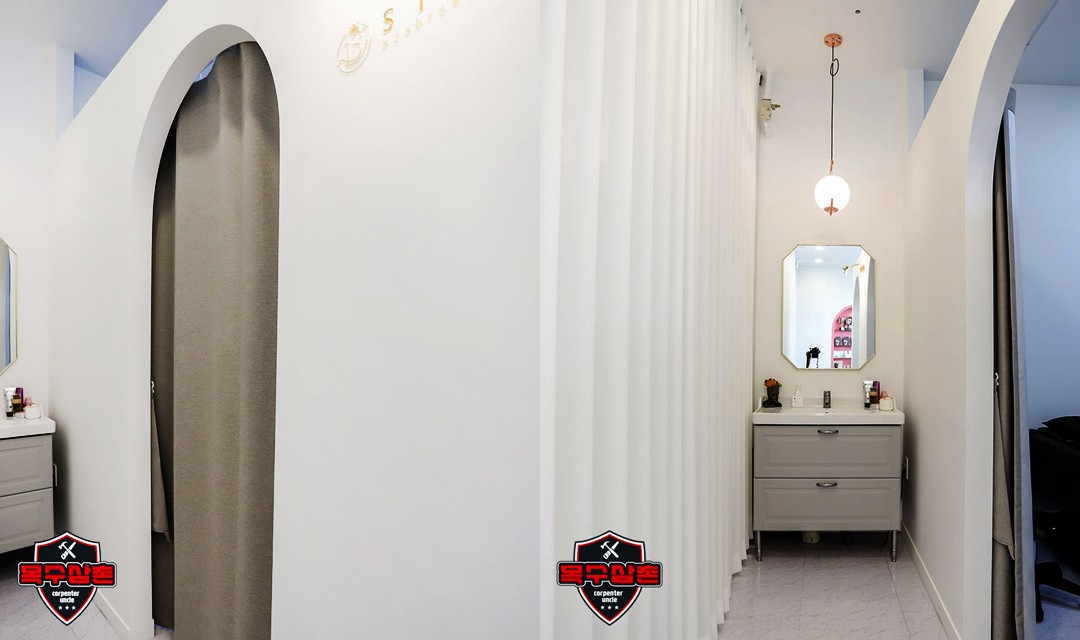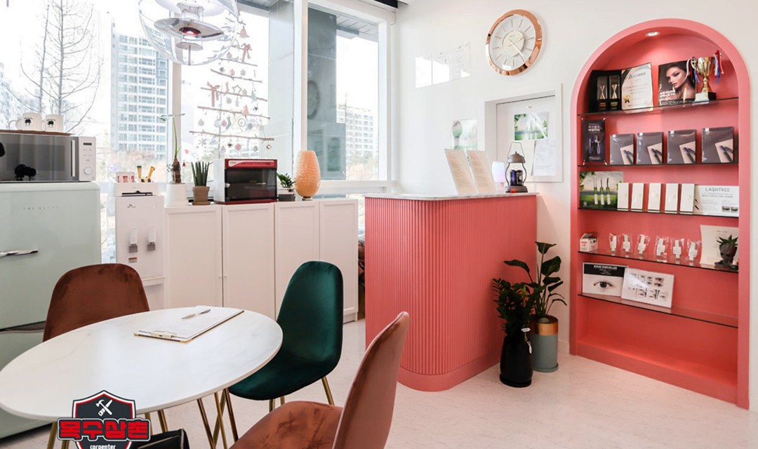 #프렌치골드 #고급 #아치 #화이트 #핑크 #할로겐조명 #템바보드 #갤러리조명 #데코타일 #상가인테리어 #뷰티샵인테리어 #속눈썹뷰티샵인테리어