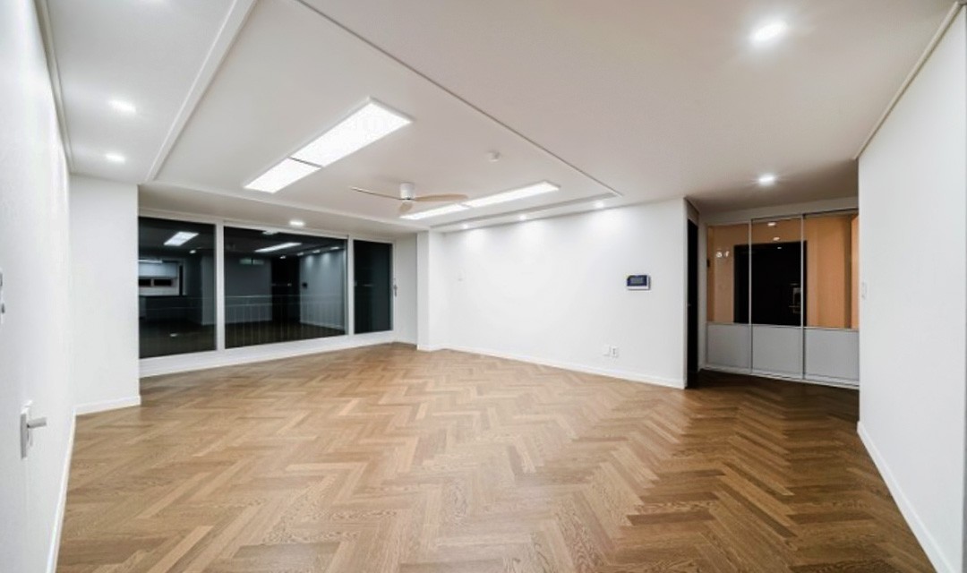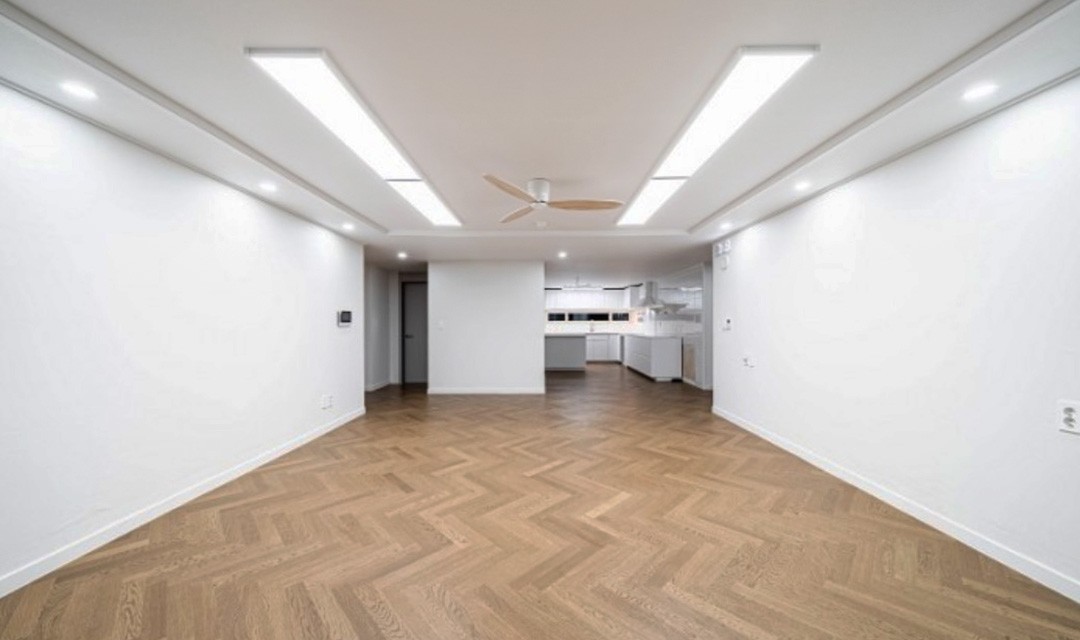 #내추럴 #모던 #거실확장 #화이트 #라이트오크 #중문 #3연동중문 #헤링본마루 #매립조명 #간접조명 #40평 #아파트인테리어