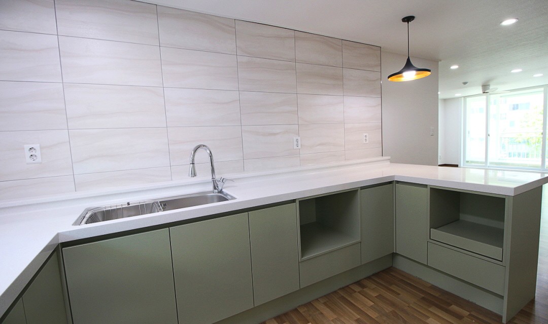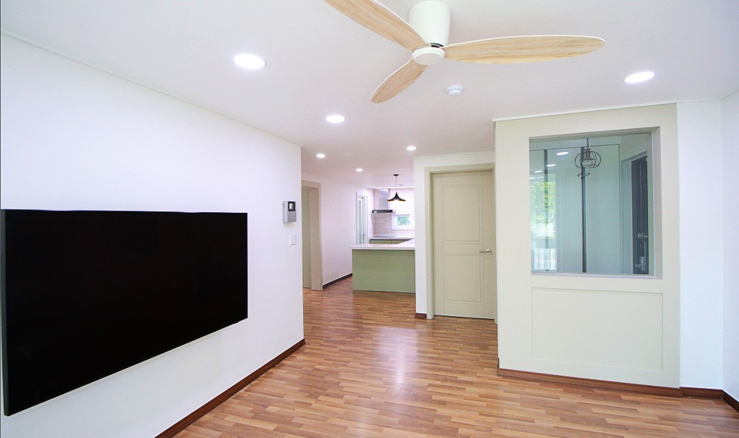 #모던 #심플 #네추럴 #중문시공 #3중연동 #타일시공 #포세린타일 #비앙코타일 #강마루시공 #실링팬 #인테리어조명 #매립조명 #올리브그린 #맞춤가구 #20평 #아파트인테리어 #신혼집인테리어