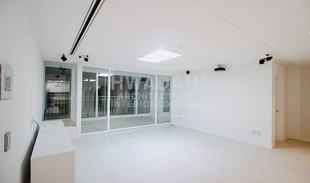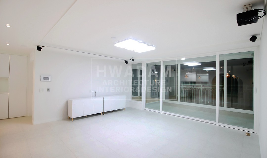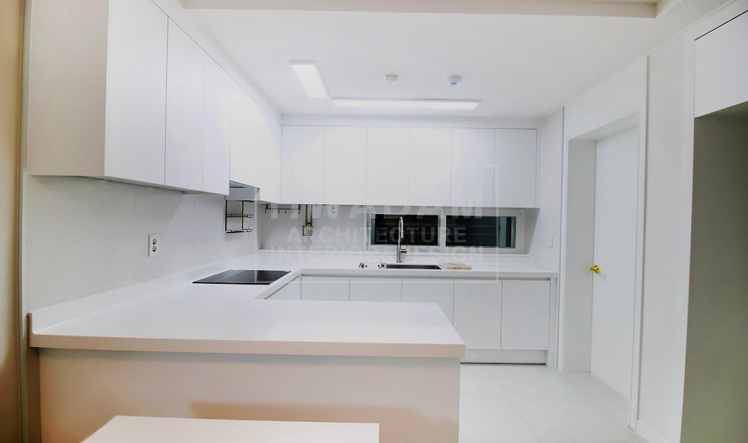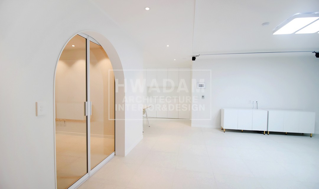#고급 #심플 #개방감 #깔끔 #아치 #실크도배 #필름시공 #목공사 #몰딩 #화이트 #그레이 #중문 #비대칭여닫이도어 #슬라이딩도어 #포세린타일패턴장판 #펜던트조명 #40평 #아파트인테리어