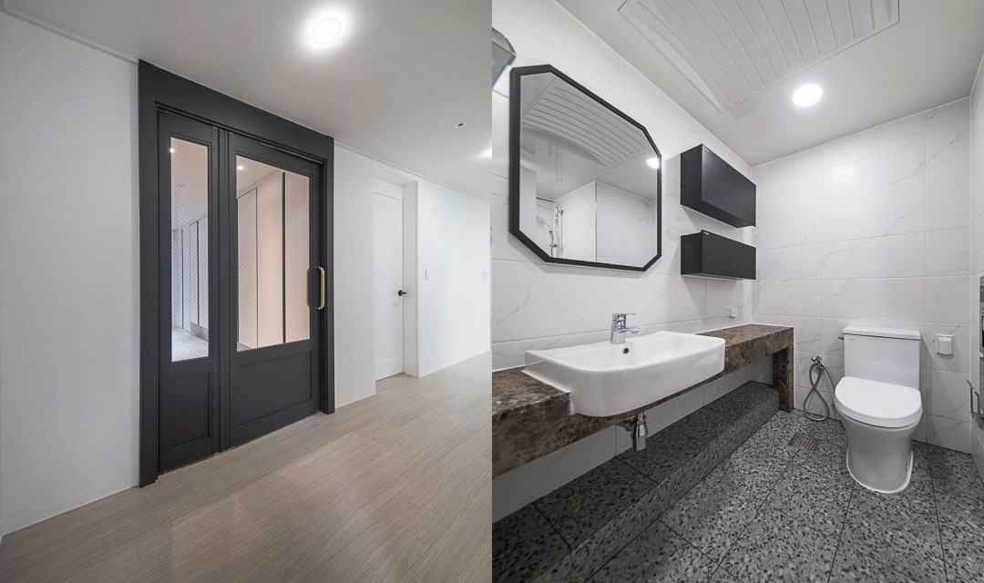 #모던 #트렌디 #심플 #구조변경 #중문시공 #프렌치중문 #타일시공 #비앙코타일 #테라조타일 #인테리어조명 #매립조명 #간접조명 #강마루시공 #40평 #아파트인테리어