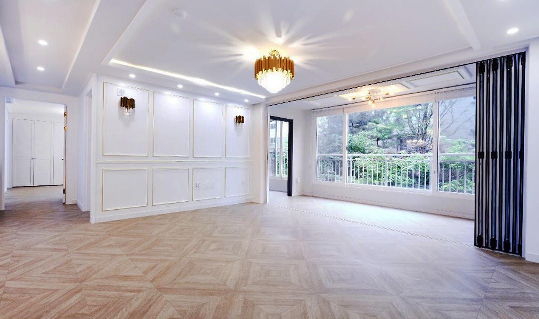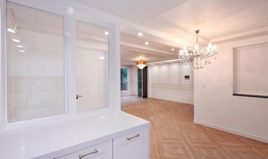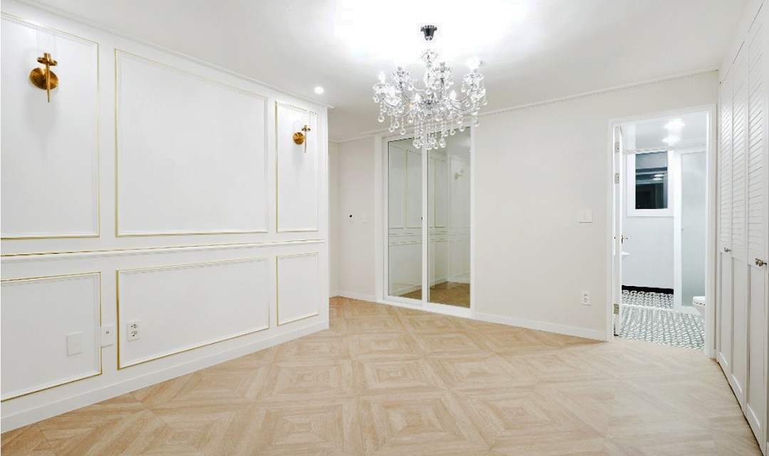 #고급 #뉴클래식 #모던 #웨인스코팅 #화이트 #골드 #블루 #중문 #폴딩도어 #샹들리에 #레일조명 #벽등 #아파트인테리어