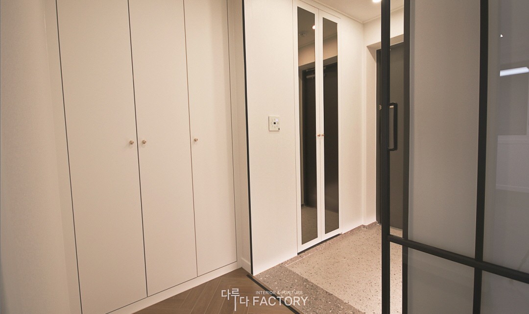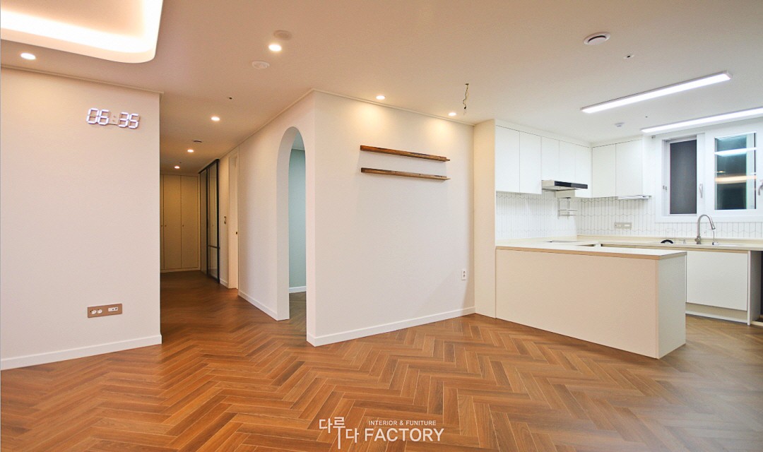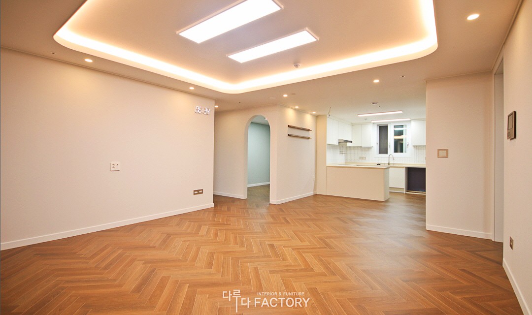 #모던 #네추럴 #트렌디 #심플 #중문시공 #슬림슬라이딩도어 #타일시공 #테라조타일 #헤링본마루 #인테리어조명 #매립조명 #간접조명 #아치포인트 #필름시공 #40평 #아파트인테리어