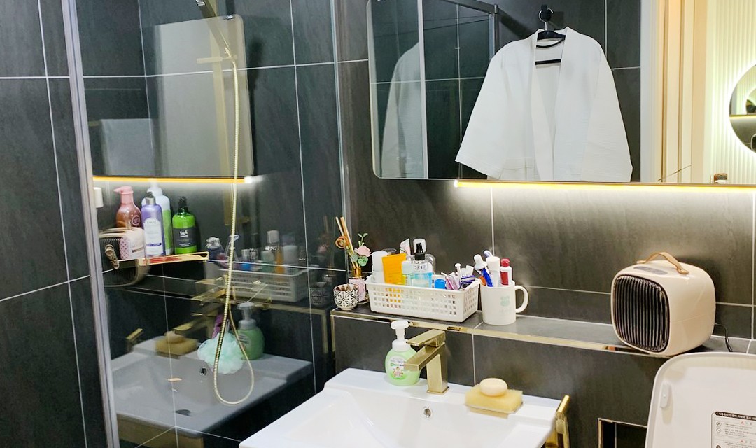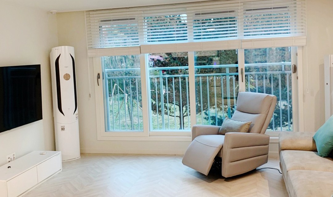 #모던 #세련 #실용 #은은 #화이트 #골드 #라이트브라운 #실링팬 #헤링본마루 #매립조명 #간접조명 #테라조타일 #아파트인테리어