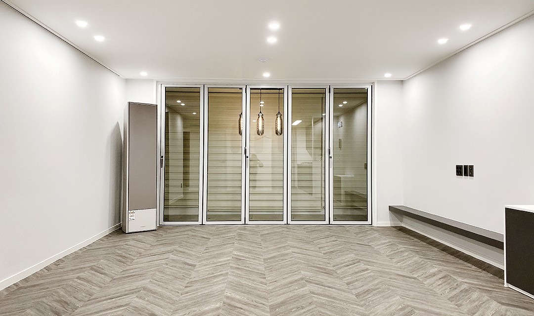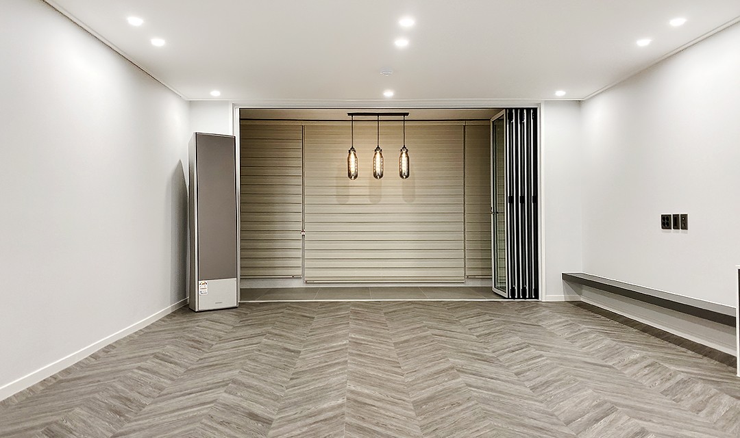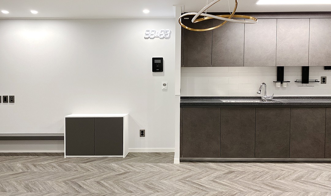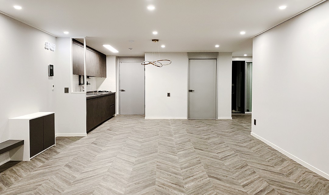 #모던 #세련 #화이트 #다크베이지 #그레이 #중문 #3연동자동문 #폴딩도어 #헥사타일 #분배기함 #펜던트조명 #간접조명 #30평 #아파트인테리어
