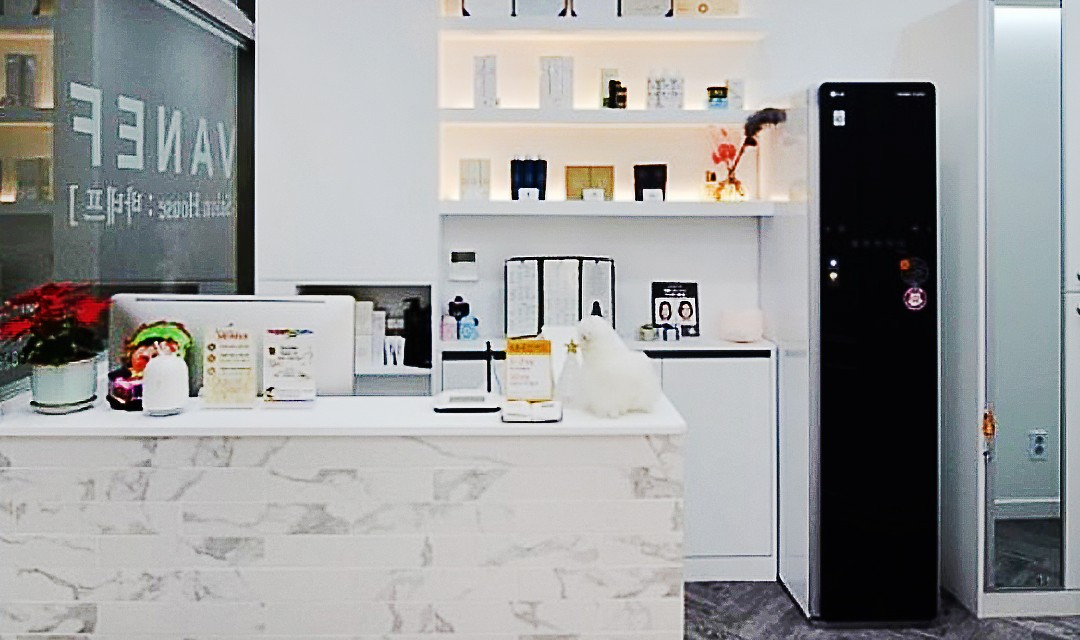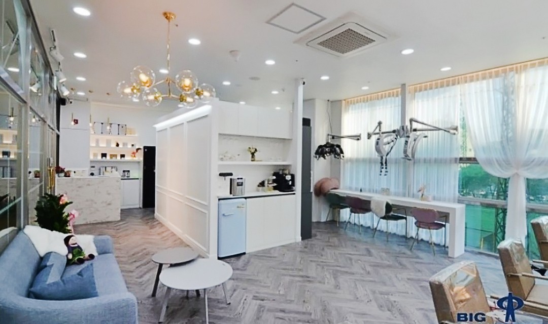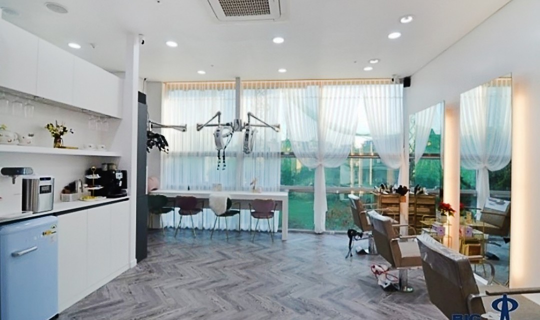 #고급 #럭셔리 #실용 #웨인스코팅 #화이트 #그레이 #포세린타일 #헤링본디자인 #펜던트조명 #간접조명 #매립조명 #상가인테리어 #미용실인테리어