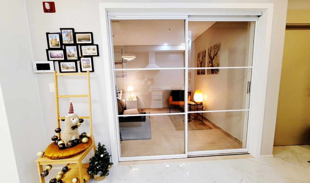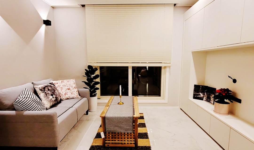 #고급 #아늑 #좁은평수 #벤치형현관장 #화이트 #중문 #3연동투명망입유리모델중문 #슬라이딩도어 #유광포세린타일 #벽등 #터치콘센트 #10평 #좁은평수 #오피스텔인테리어 #모델하우스인테리어