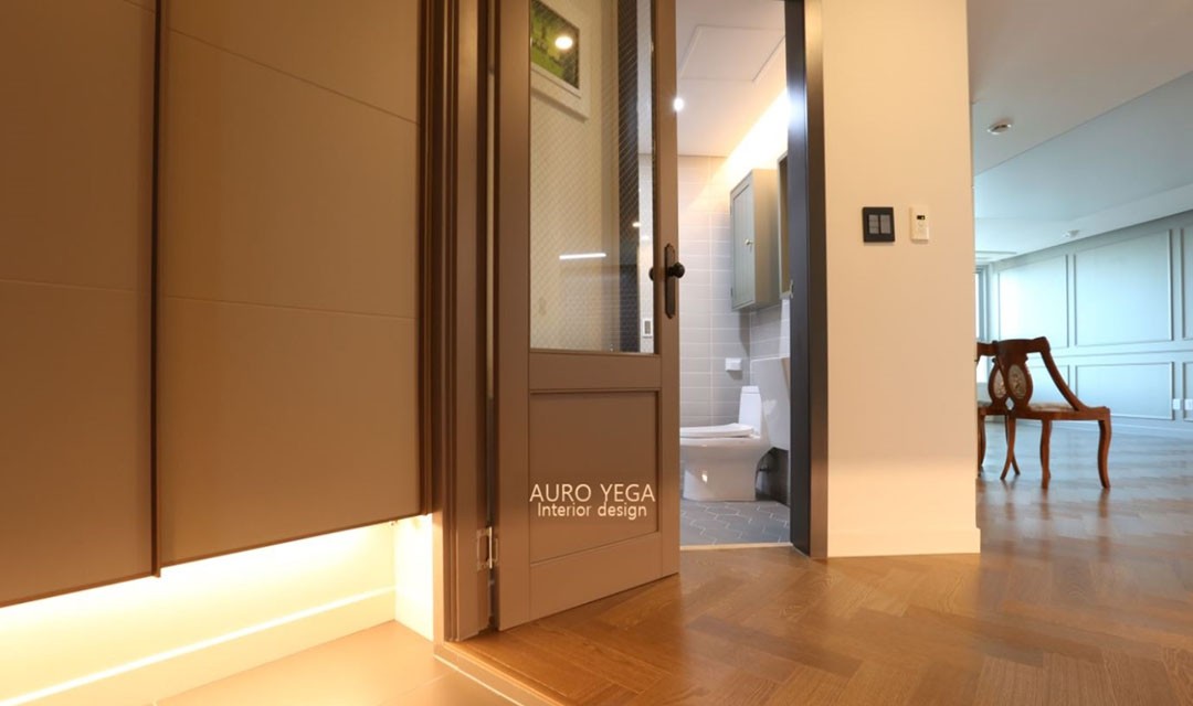 #모던 #클래식 #엔틱 #웨인스코팅 #브라운 #화이트 #중문 #헤링본마루 #바리솔조명 #간접조명 #아파트인테리어