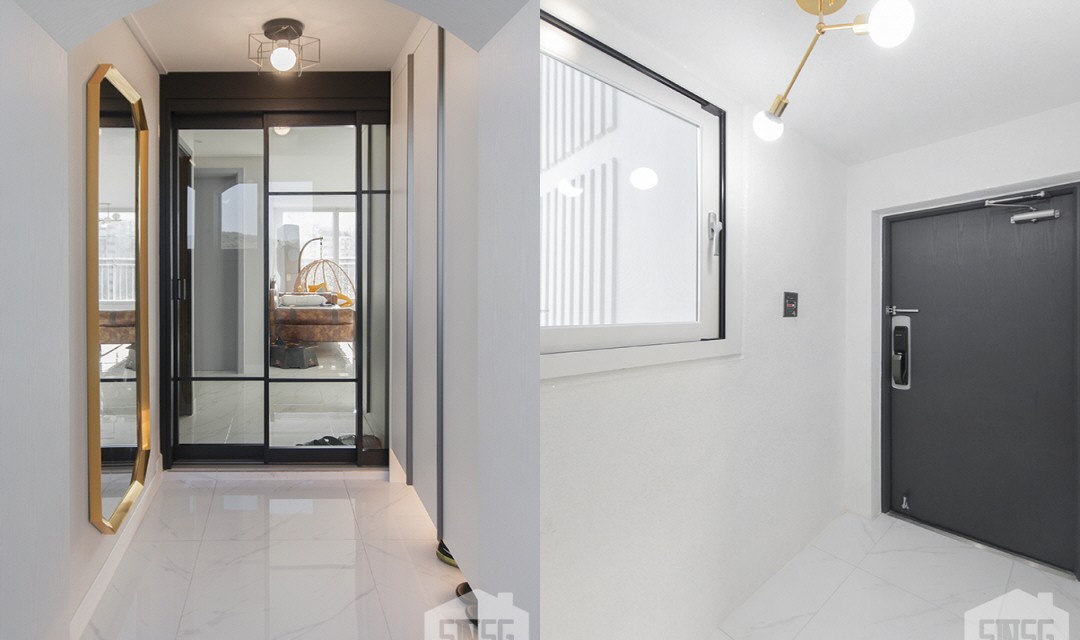 #모던 #럭셔리 #네추럴 #유니크 #중문시공 #3중연동 #타일시공 #비앙코타일 #폴리싱타일 #인테리어조명 #마루시공 #벽지시공 #그레이 #화이트 #아치포인트 #30평 #아파트인테리어