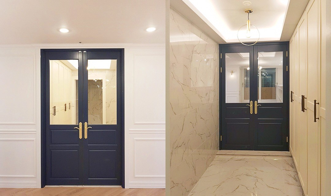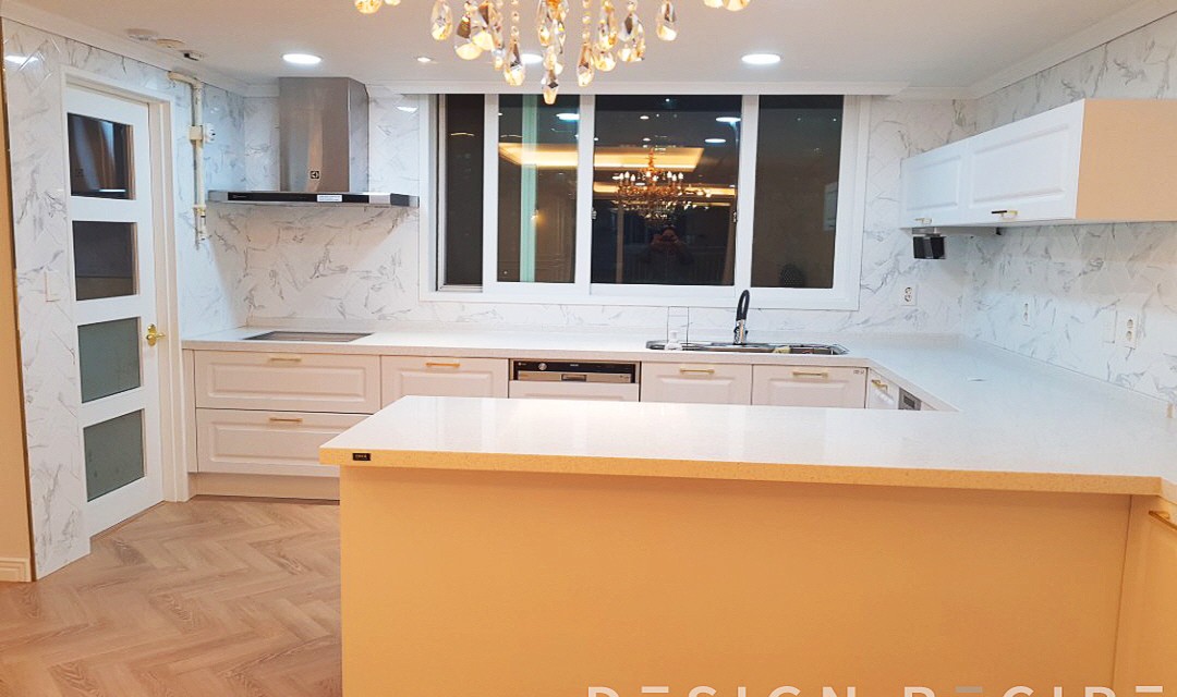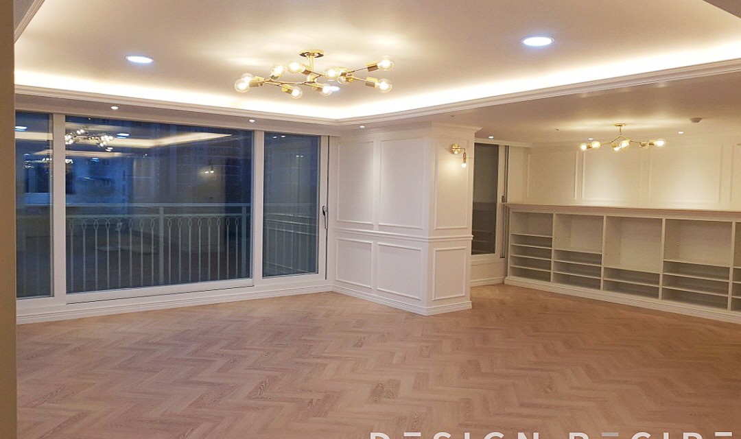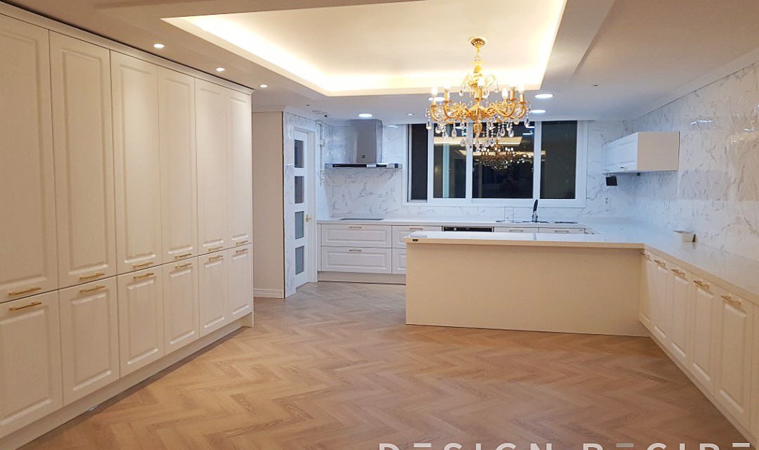 #럭셔리 #트렌디 #클래식 #유니크 #유럽풍 #중문시공 #양개도어 #프렌치중문 #타일시공 #비앙코타일 #인테리어조명 #매립조명 #샹들리에 #헤링본마루 #웨인스코팅 #맞춤가구 #화이트 #골드 #블랙 #40평 #아파트인테리어
