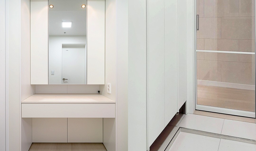 #모던 #네추럴 #심플 #트렌디 #중문시공 슬림슬라이딩도어 #타일시공 #폴리싱타일 #인테리어조명 #제작가구 #필름시공 #가벽설치 #화이트