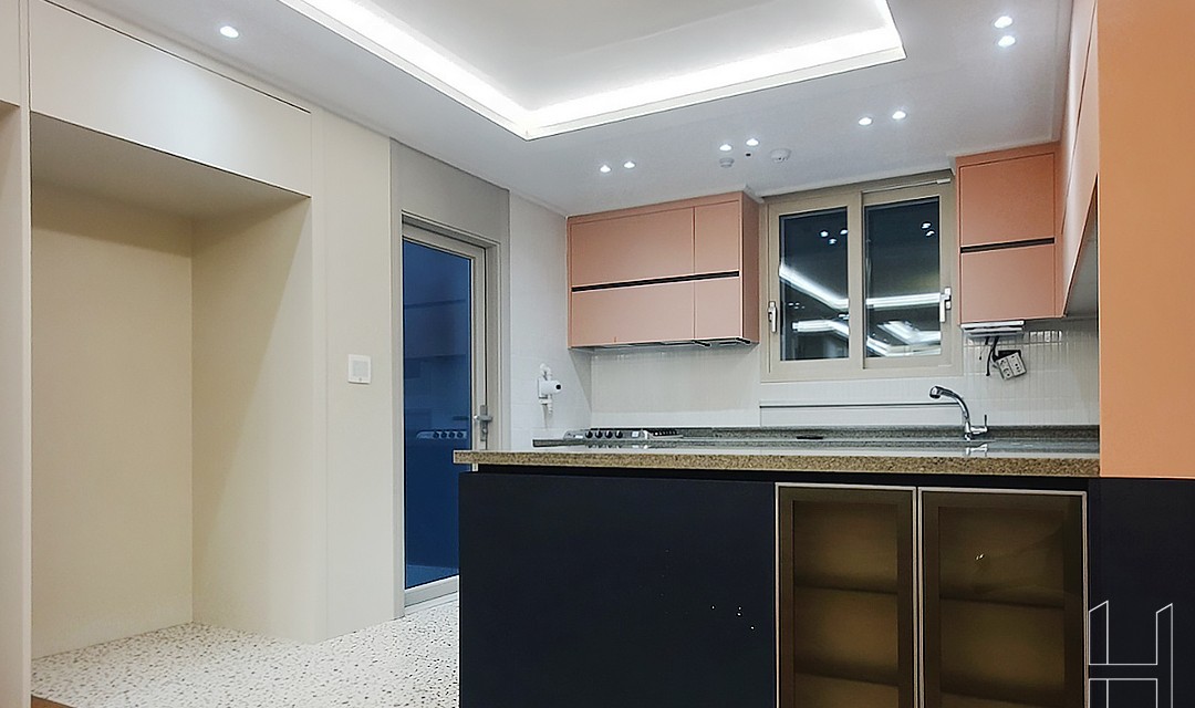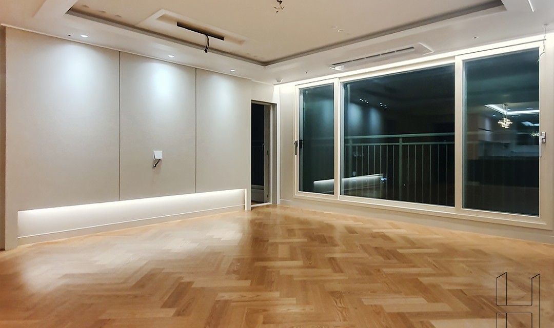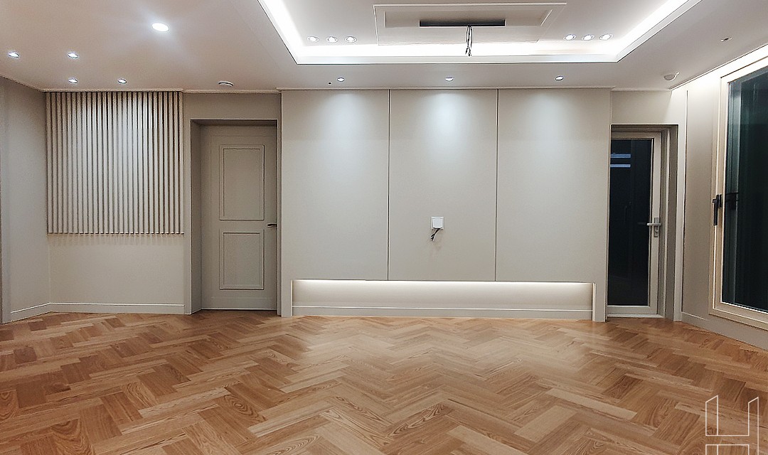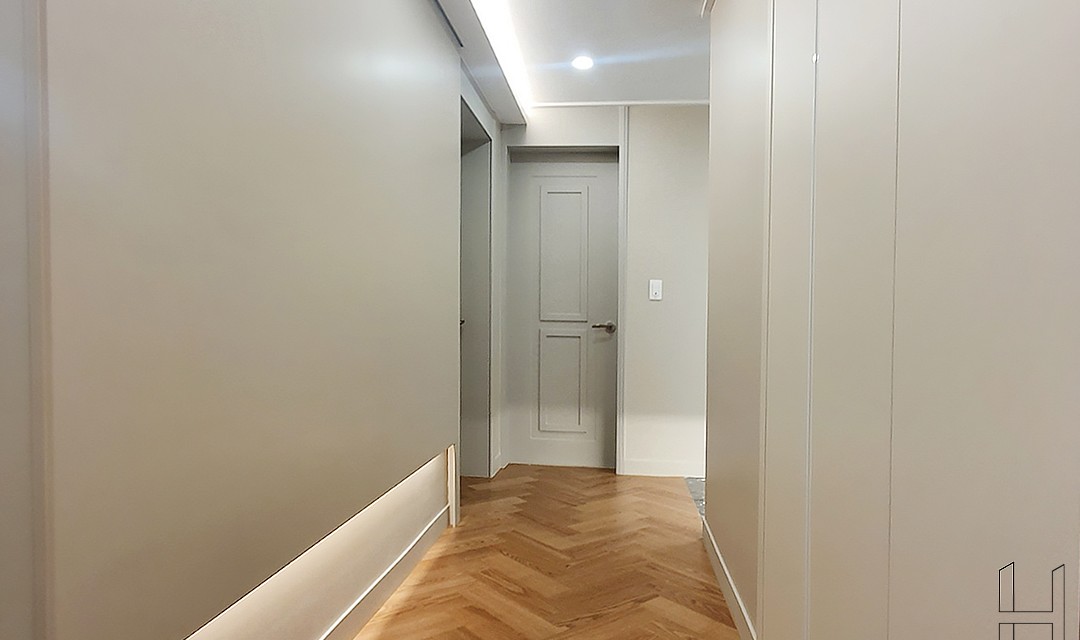 #모던 #공간감 #은은한 #세련 #목공사 #필름시공 #도배 #컬러포인트 #브라운 #화이트 #민트 #헤링본마루 #후르츠테라조 #매립조명 #간접조명 #30평 #아파트인테리어
