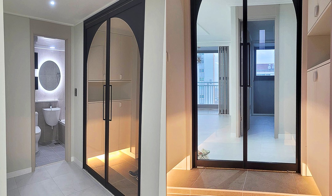 #모던 #네추럴 #심플 #트렌디 #중문시공 #양개도어 #타일시공 #포세린타일 #아치포인트 #인테리어조명 #간접조명 #화이트 #20평 #아파트인테리어 #신혼집인테리어