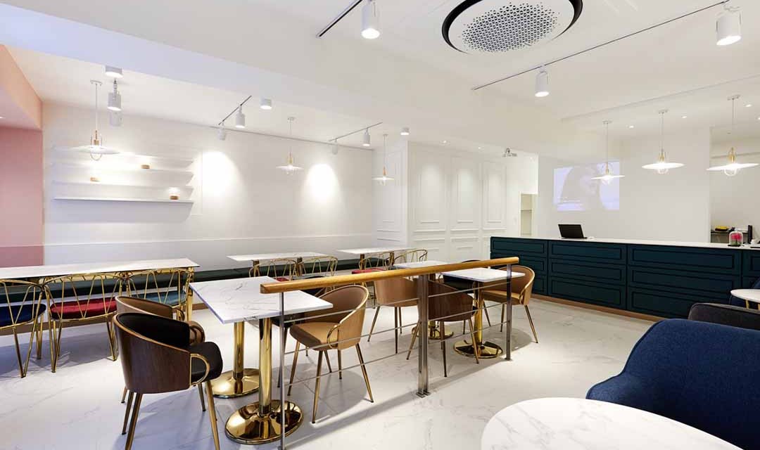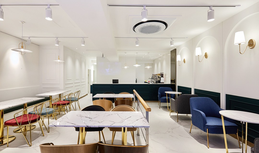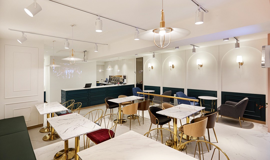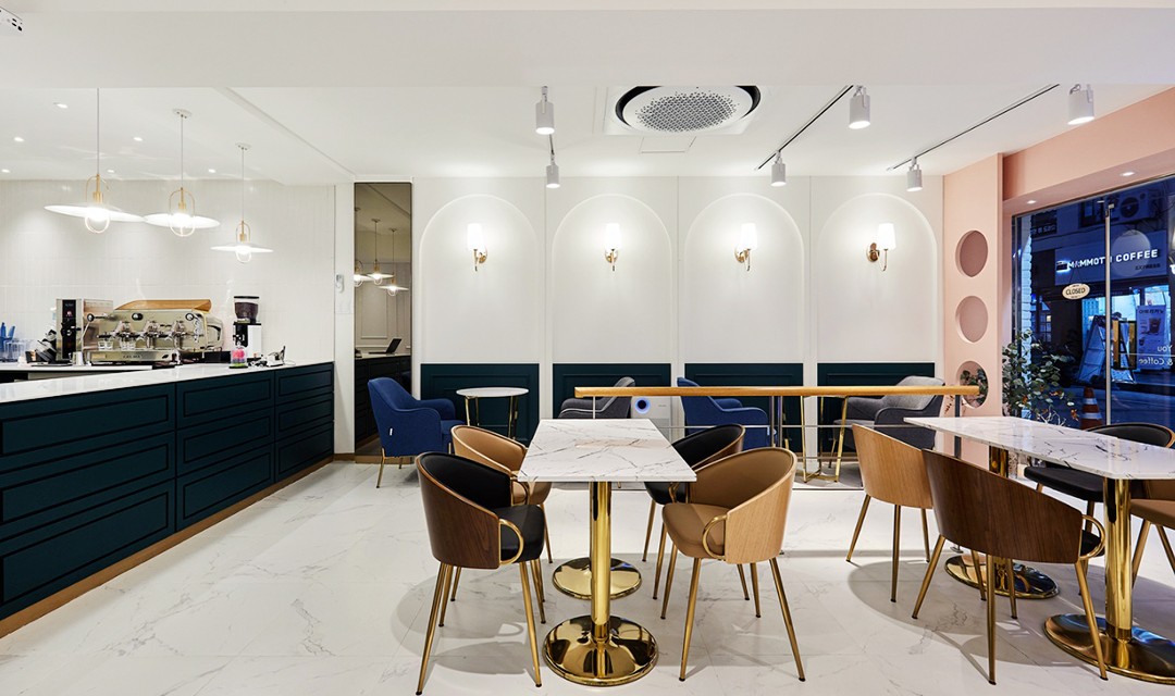 #고급 #뉴클래식 #화사한 #우드 #웨인스코팅 #화이트 #딥그린 #베이비핑크 #골드 #벽등 #레일조명 #비앙코타일 #파티션 #20평 #상가인테리어 #카페인테리어