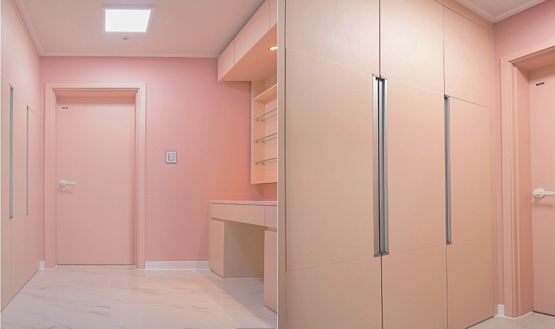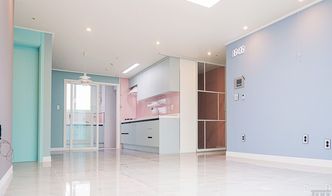 #러블리 #모던 #트렌디 #감성 #유니크 #중문시공 #슬림슬라이딩도어 #타일시공 #폴리싱타일 #비앙코타일 #인테리어조명 #간접조명 #확장시공 #벽지도배 #포인트컬러 #30평 #아파트인테리어 #신혼집인테리어