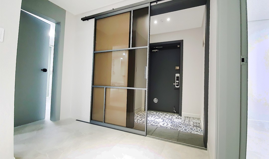 #모던 #트렌디 #깔끔한 #화이트 #그레이 #포세린타일 #폴딩도어 #중문 #슬라이딩도어 #매립조명 #50평 #아파트인테리어