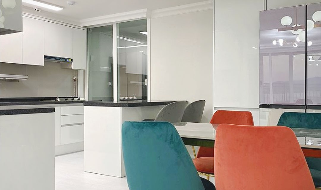 #고급 #깔끔 #심플 #트렌디 #필름시공 #화이트 #골드 #중문 #3연동슬라이딩도어 #은행목장판 #아일랜드식탁 #센서등 #간접조명 #매립조명 #40평 #아파트인테리어
