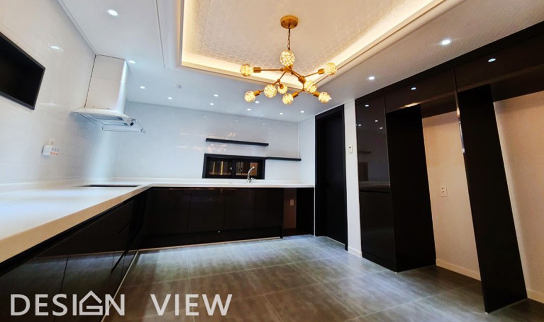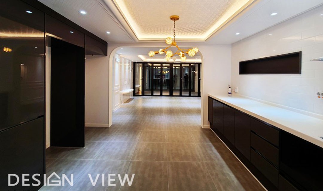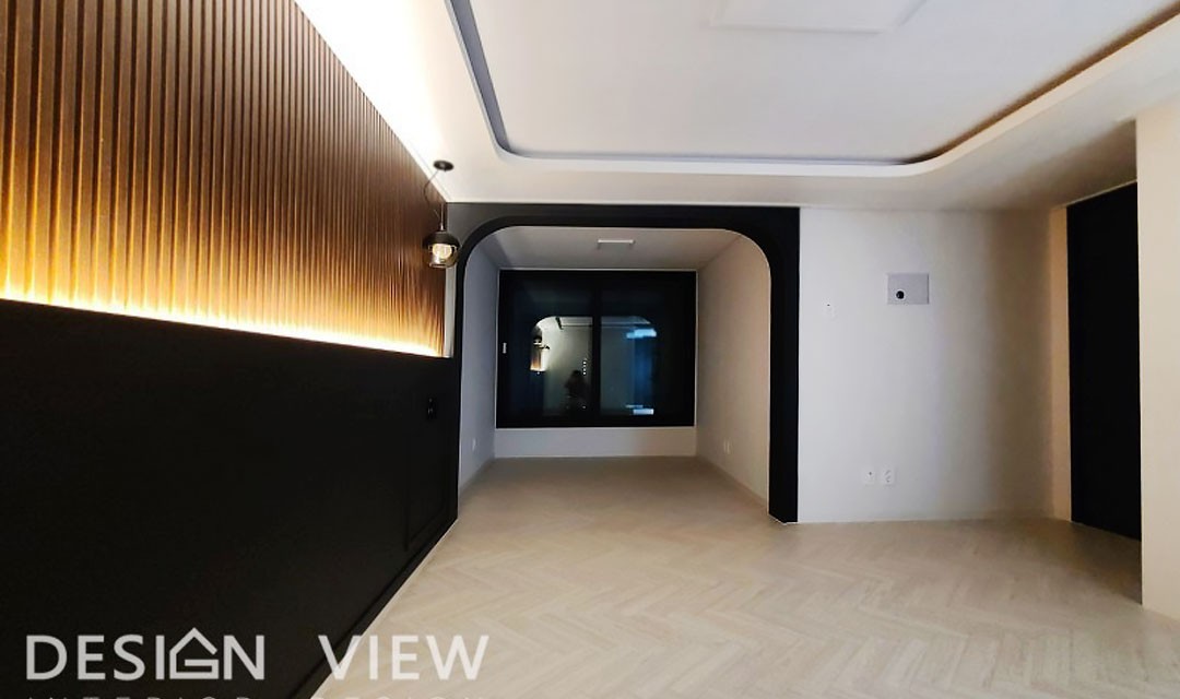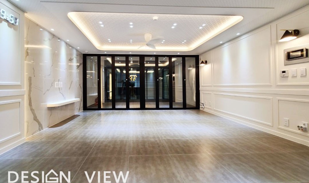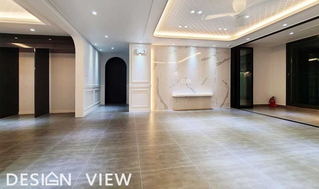 #뉴클래식 #럭셔리 #고급 #실크도배 #웨인스코팅 #아치 #화이트 #그레이 #중문 #헤링본마루 #포세린타일 #실링팬 #간접조명 #아파트인테리어