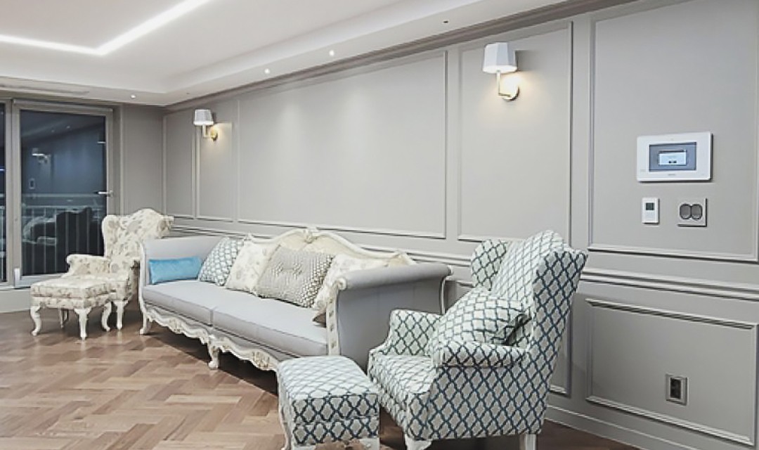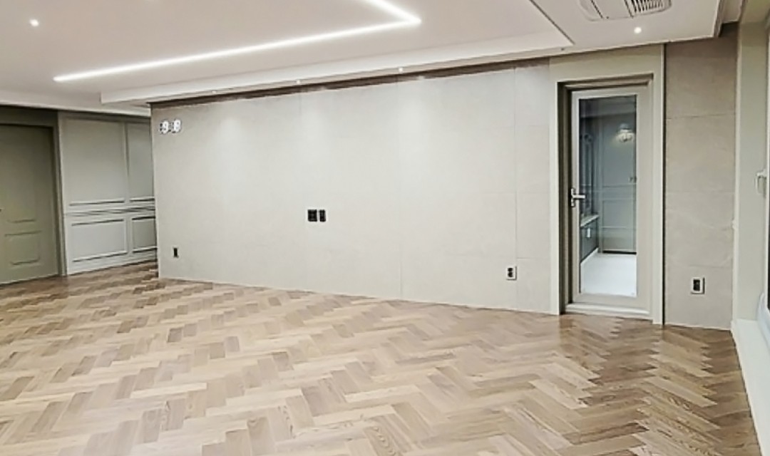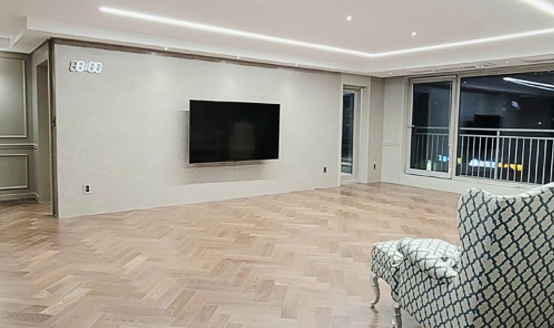 #모던클래식 #고급 #럭셔리 #웨인스코팅 #그레이 #브라운 #화이트 #골드 #중문 #양개형도어 #헤링본마루 #아트월 #포세린타일 #간접조명 #라인조명 #벽등 #60평 #아파트인테리어