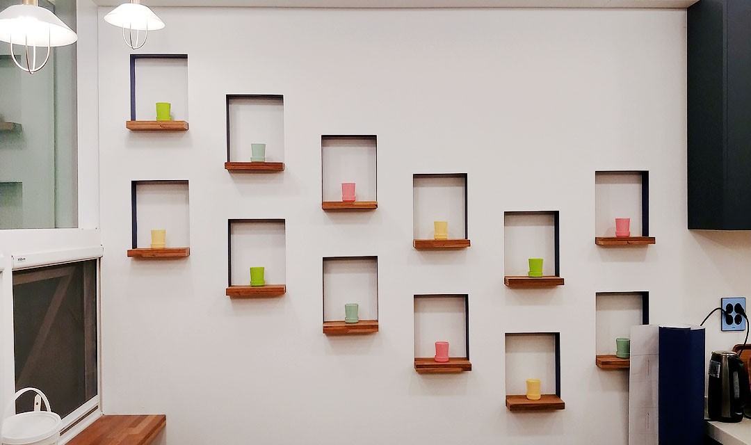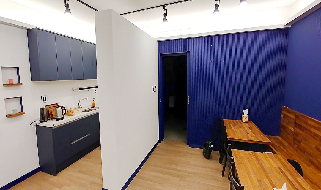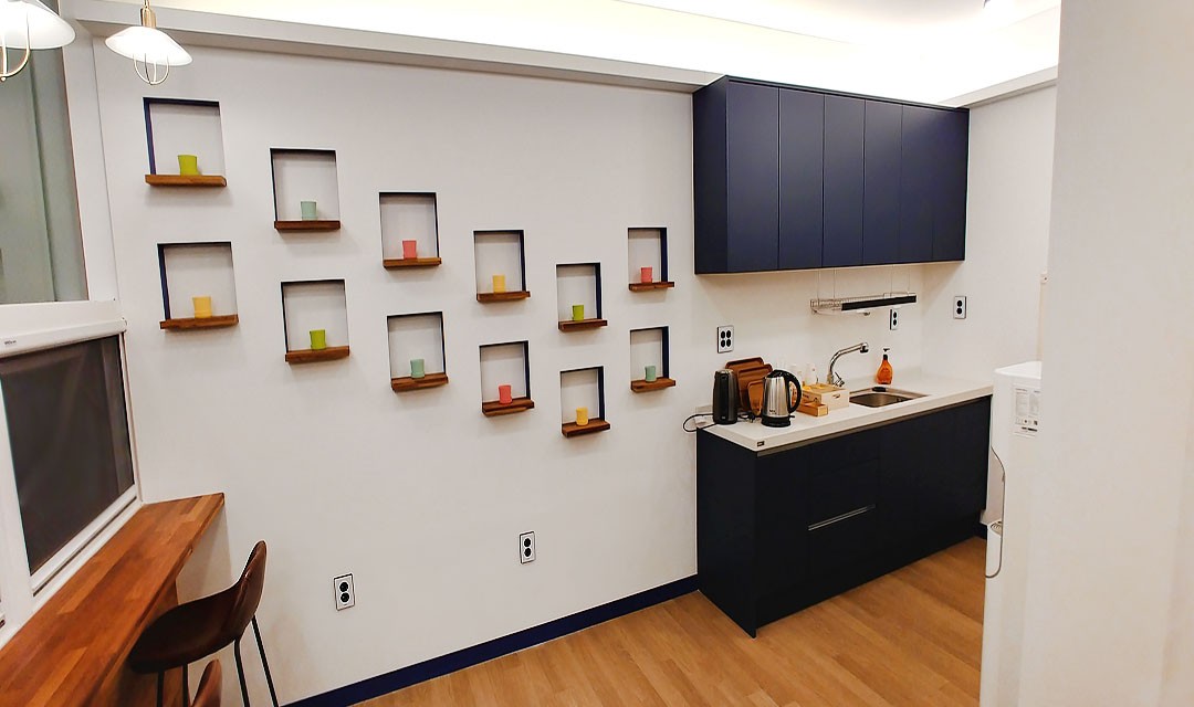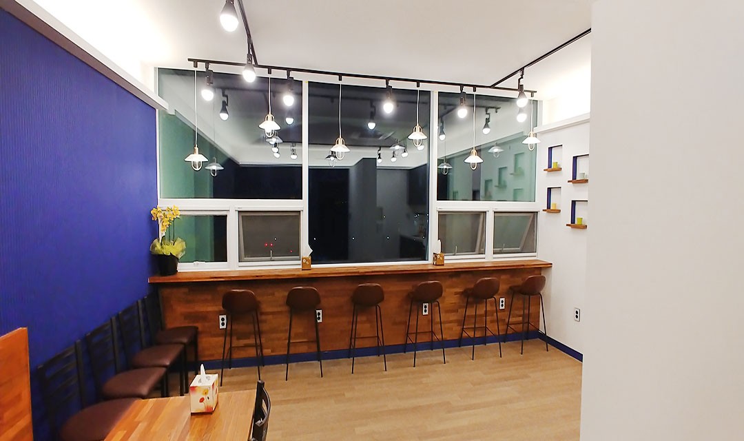 #심플 #세련 #편안한 #우드 #화이트 #블루 #라이트브라운 #포인트조명 #상가인테리어 #휴게실인테리어