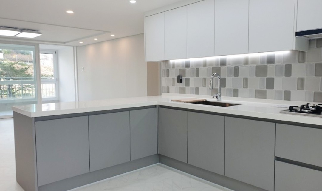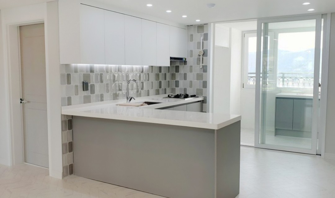 #모던 #세련 #트렌디 #필름시공 #실크도배 #화이트 #그레이 #중문 #초슬림3연동도어 #아일랜드식탁 #헤링본마루 #아트월 #매립조명 #아파트인테리어