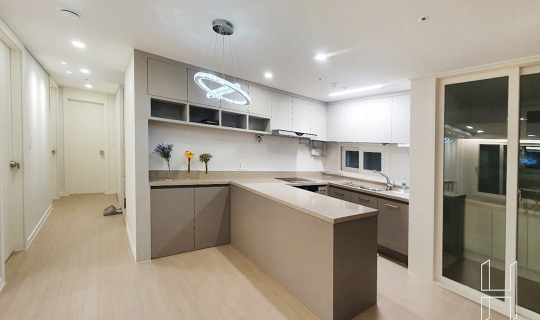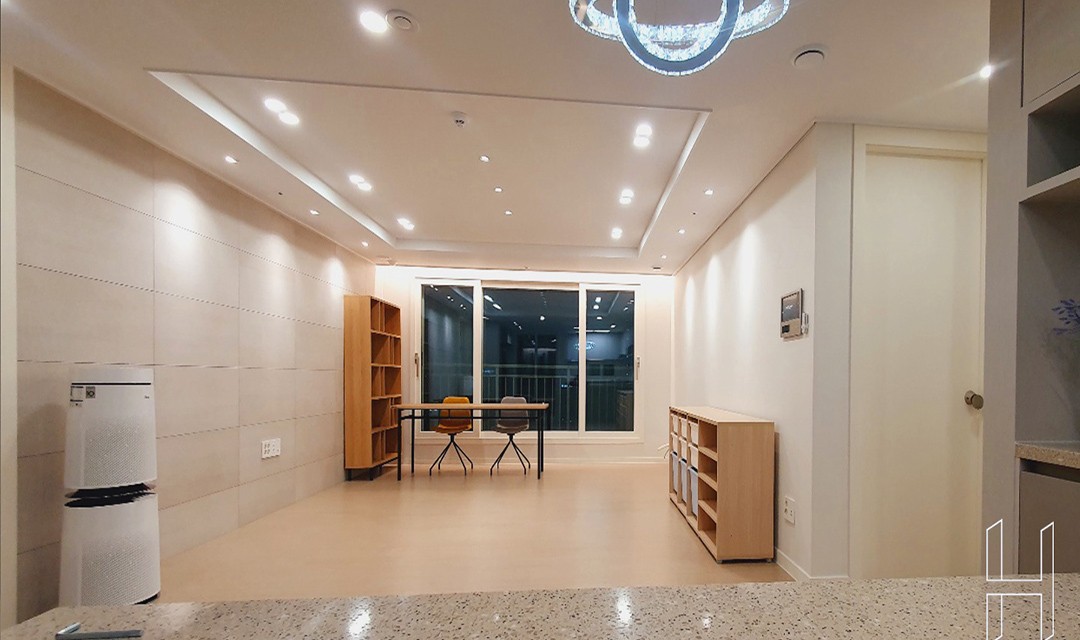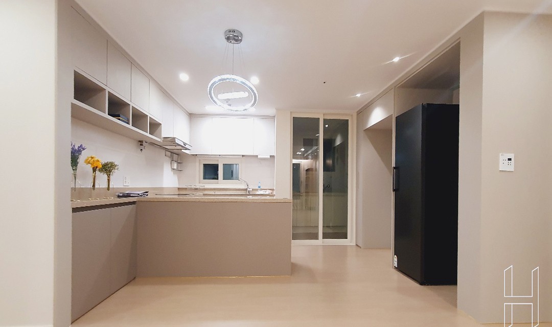 #모던 #고급 #세련 #필름시공 #목공사 #투톤도배 #화이트 #그레이 #진브라운 #매립조명 #다운라이트 #수입타일 #30평 #아파트인테리어