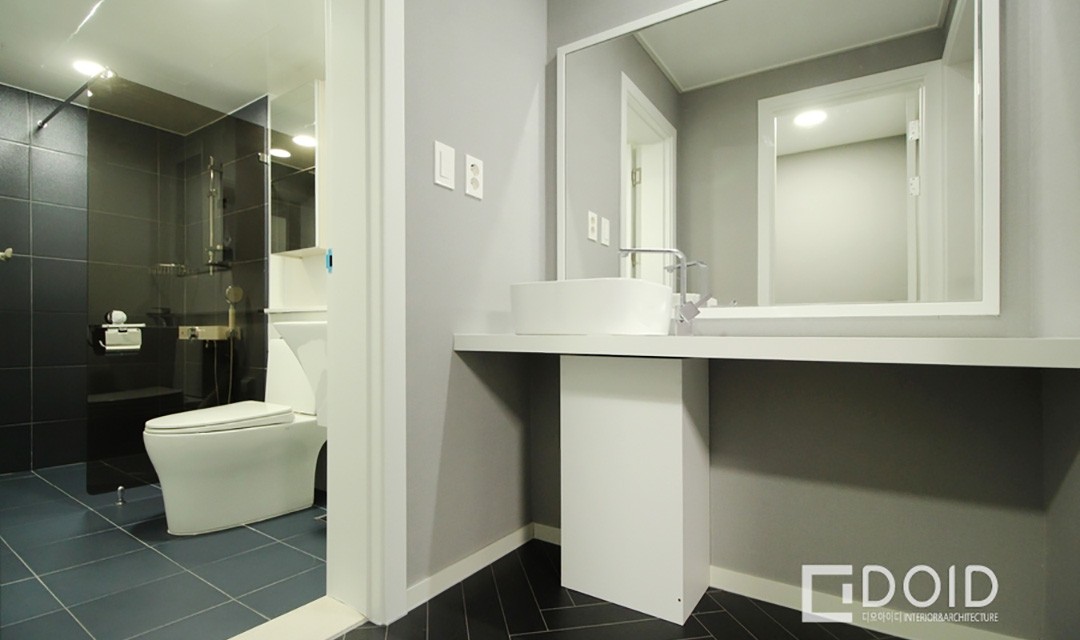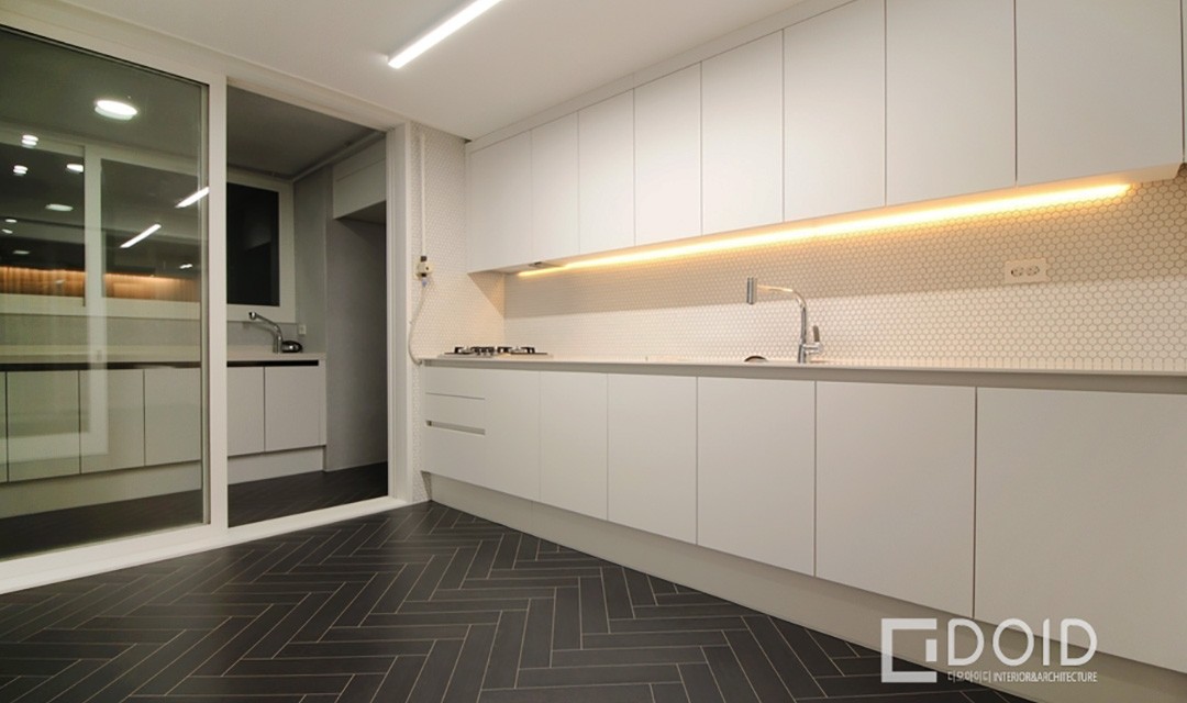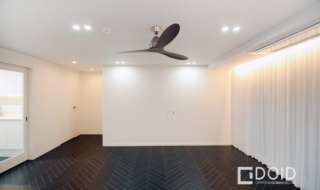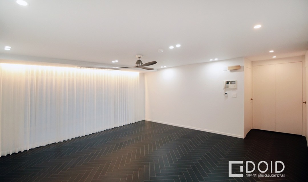 #고급 #무드 #심플 #세련 #필름시공 #도장작업 #설비공사 #무몰딩 #우드 #화이트 #헤링본마루 #실링팬 #현관세면대 #간접조명 #매립조명 #30평 #아파트인테리어