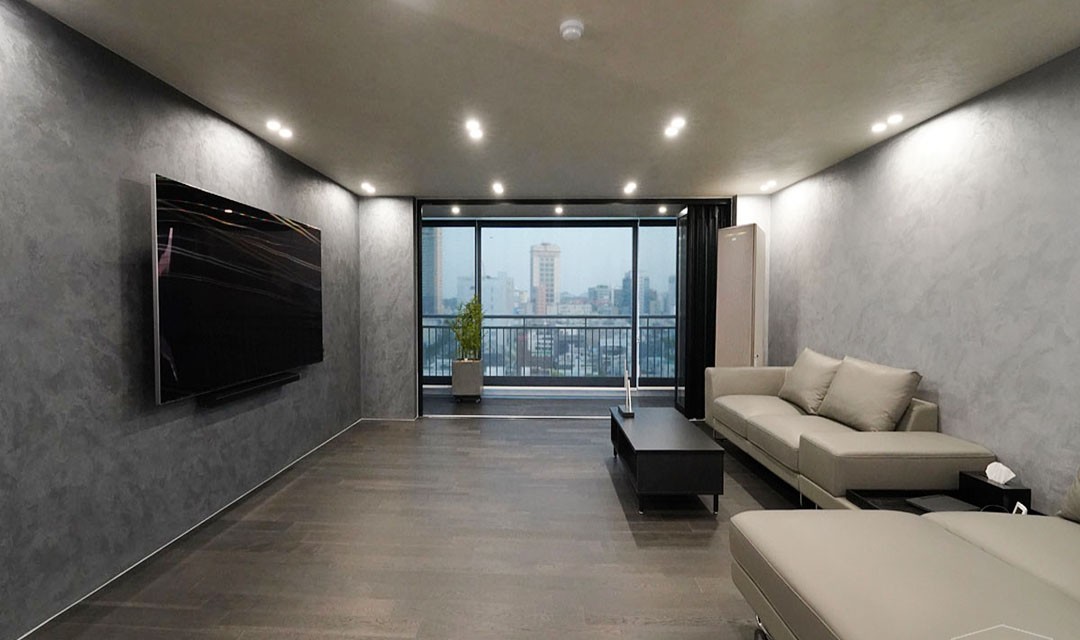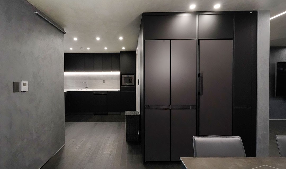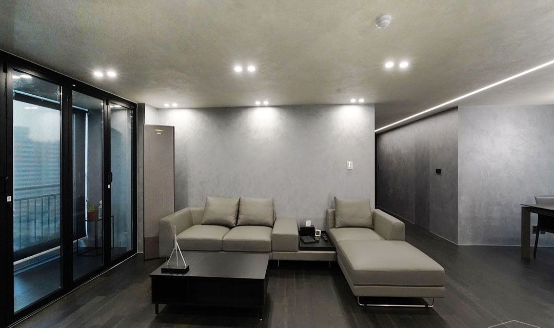 #고급 #모던 #시크 #거실확장 #무몰딩 #그레이 #블랙 #중문 #초슬림3연동중문 #폴딩도어 #히든도어 #매입조명 #간접조명 #라인조명 #50평 #아파트인테리어 #홈짐인테리어 #homegym